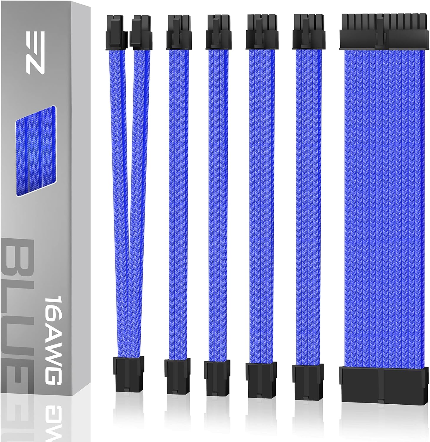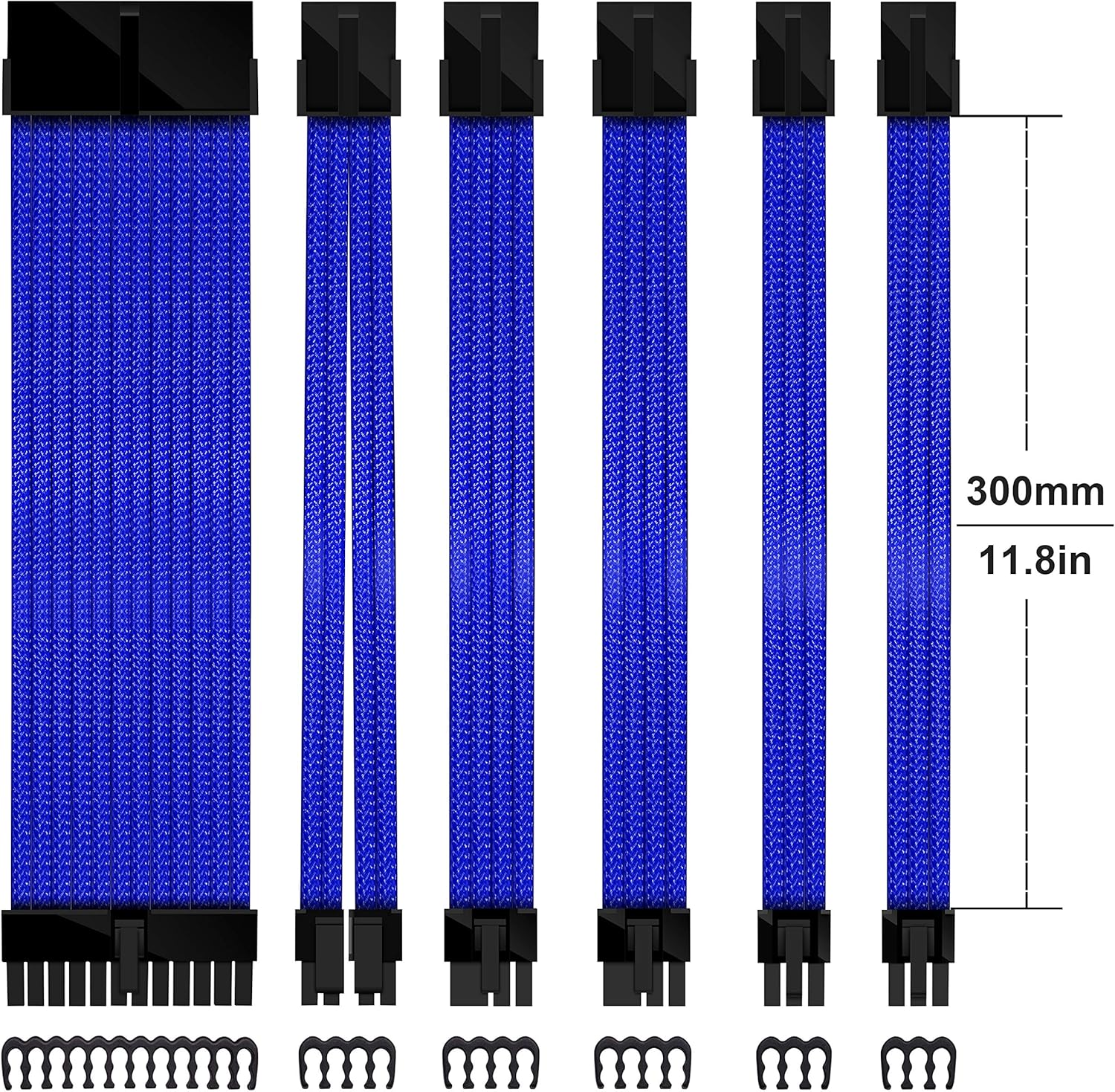EZDIY-FAB PSU Cable Extension kit Sleeved Cable Custom Power Supply Sleeved Extension 16 AWG 24-PIN 8-PIN 6-PIN 4+4-PIN with Combs- Blue