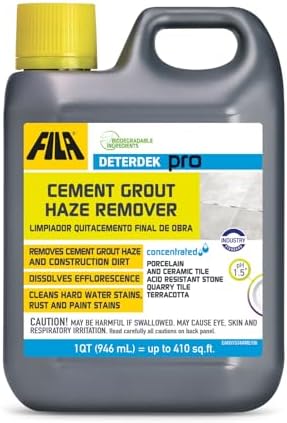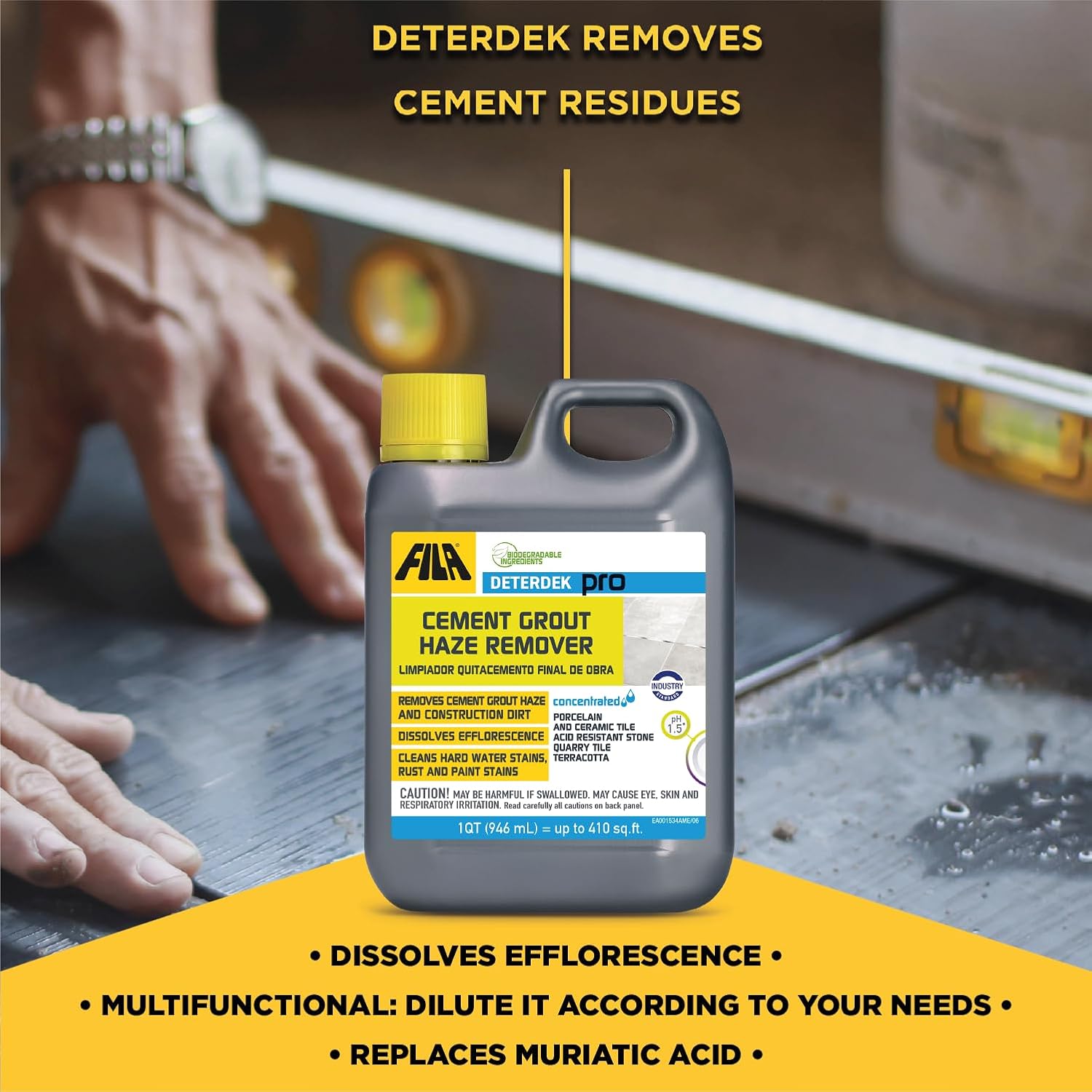 DETERDEK Grout Haze Remover is a concentrated, eco-friendly, post-installation cleaner. The cementitious grout haze cleaner removes efflorescence, lime deposits and hard water stains from porcelain, ceramic, acid resistant stone (granite, quartzite and unpolished stone), quarry tile and terracotta surfaces. DETERDEK also effectively removes inorganic construction dirt like dust and sheet rock.ADVANTAGES•Concentrated formula: high coverage.•Eco-friendly: does not emit fumes that are harmful to people or the environment. A welcome alternative to muriatic acid.•Does not alter the color of the material.•Does not damage or corrode aluminum and steel trims when used according to the application instructions.•Can be used as a cleaner or limescale remover, based on the dilution.•Biodegradable.Caution: Do not use on acid sensitive stone such as marble, limestone, ortravertine. Test the product on a small, inconspicuous area of the surface or loosesample prior to full application.FILA cleaners and sealers, used in the most prestigious surface cleaning and protection projects worldwide, are recommended by more than 200 stone and tile manufacturers. FILA products are requested by informed customers that look for the very best in the cleaning and treatment of surfaces. For more information about this product, scroll down and click on the “Product Description” button.