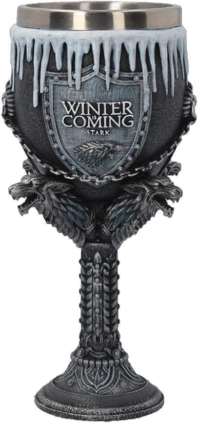 This product is for ornamental use. Show your allegiance to the King in the North with this magnificent Stark Goblet. Rising from an imposing black base, the stem of this Goblet is seemingly made of black iron, interlocking chainmail and riveted plates rising up. At the top, four proud Stark dire wolves point outwards, supporting the body. The sides of the Goblet have grey shields, each bearing the house Sigel of a dire wolf and the motto Winter is Coming. Chains hang down below the shields, anchored to rivets between them. The truth of the motto is illustrated by the frozen icicles hanging down around the steel rim. Cast in the finest resin before being lovingly hand-painted, this Goblet comes with a removable stainless steel insert for ease of cleaning.
