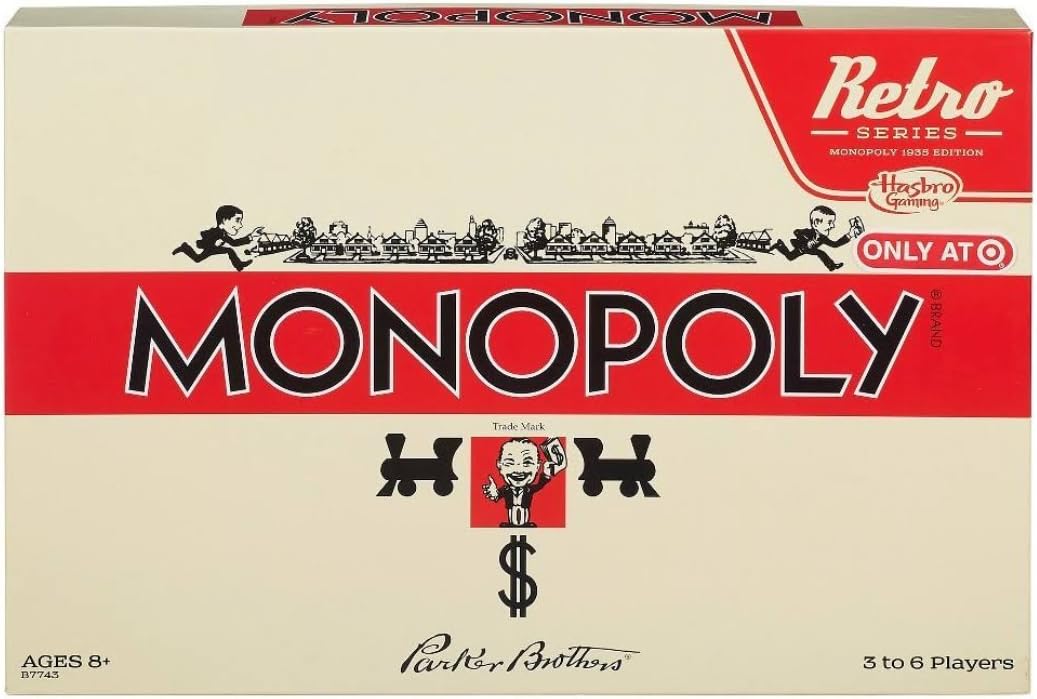 Viaja en el tiempo y juega al rápido juego de compra y venta de propiedades con algunos de sus diseños originales. ¡Esta edición del juego de Monopolio presenta el aspecto y la sensación de la edición clásica de 1935! El juego original fue creado por Charles B. Darrow durante la Gran Depresión. ¡El mundialmente famoso juego de Monopolio permite a todos disfrutar de un toque de la alta vida! Esta edición retro del juego de Monopolio presenta ilustración del tablero de juego, colores del conjunto de propiedades, ilustración del dinero, y cartas de Oportunidad y Comunidad, todas con ilustración inspirada en el juego original. También incluye casas y hoteles de madera. Para 3 a 6 jugadores. Los nombres y logotipos de Hasbro Gaming, Parker Brothers y Monopoly, el diseño distintivo del tablero de juego, las cuatro esquinas, el nombre y personaje del Sr. Monopolio, así como cada uno de los elementos distintivos del tablero y piezas de juego son marcas comerciales de Hasbro para su juego de compra y venta de propiedades y equipo de juego. Incluye 1 tablero de juego, 6 fichas, 28 cartas de título de propiedad, 16 cartas de Oportunidad, 16 cartas de Comunidad, 32 casas, 12 hoteles, 1 tarjeta del Banco, 1 paquete de dinero, 2 dados y guía del juego. Esta edición retro del juego de Monopolio está inspirada en la edición de 1935. Para 3 a 6 jugadores