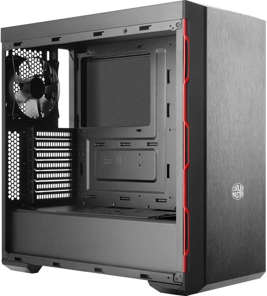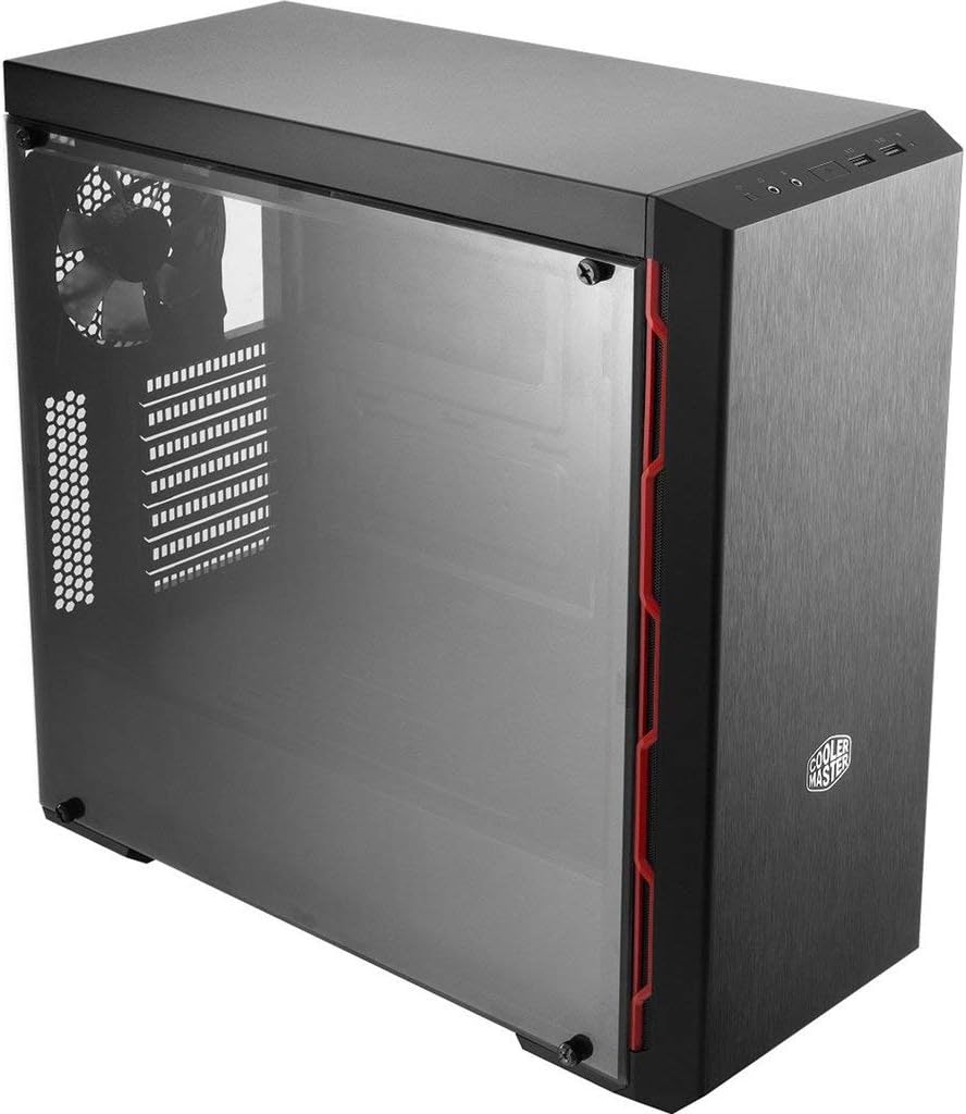 «La Master Box MB600L está diseñada para integrarse en su entorno. Su diseño elegante la convierte en la mejor opción para uso doméstico o de oficina, y el panel frontal cepillado y el borde lateral rojo le dan a la funda un aspecto elegante. El panel lateral acrílico transparente de borde a borde proporciona un fácil acceso y una visión clara de los componentes internos de la construcción. El interior de la caja tiene un revestimiento negro completo y una cubierta de fuente de alimentación, lo que ayudará a facilitar una construcción limpia con una fácil gestión de los cables». Enrutamiento de cables: detrás de la bandeja de la placa base 0.59-0.90