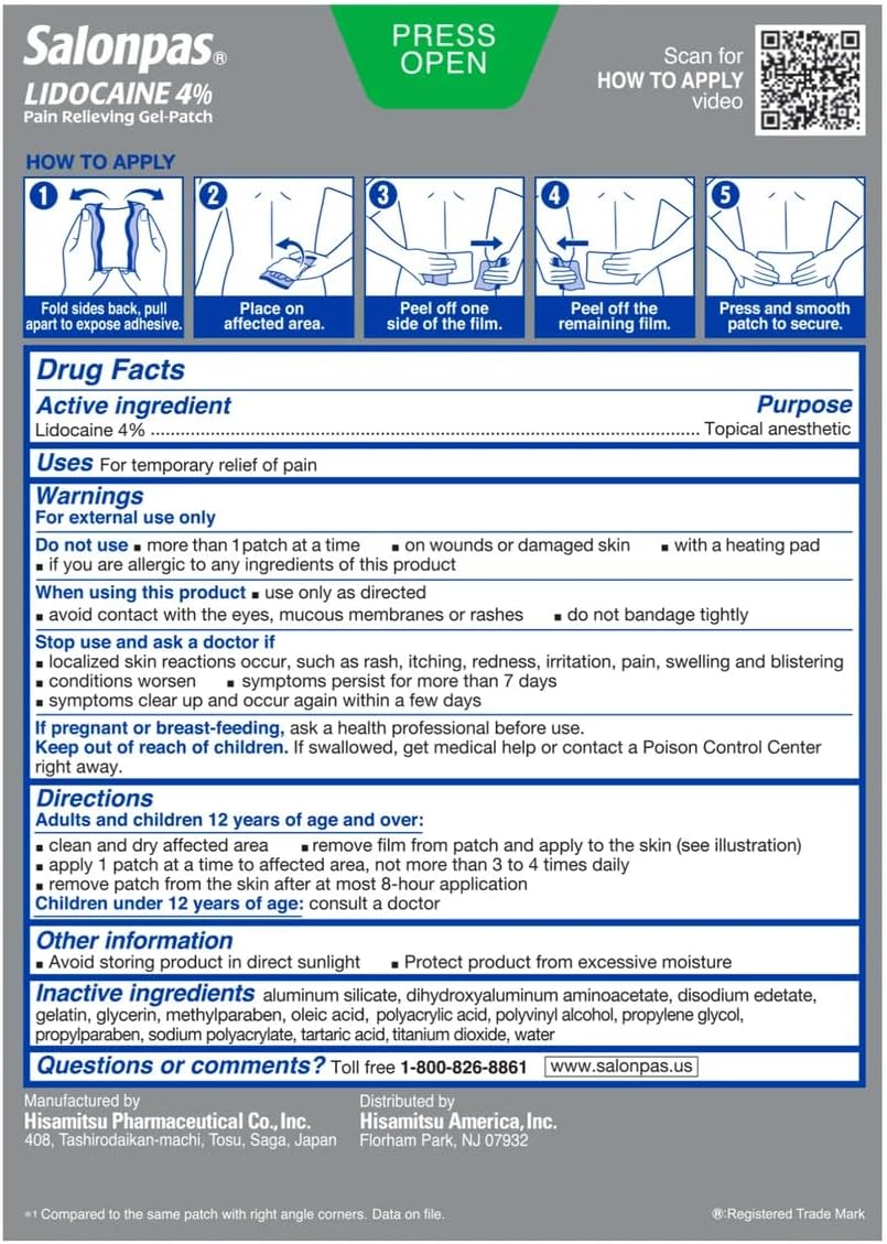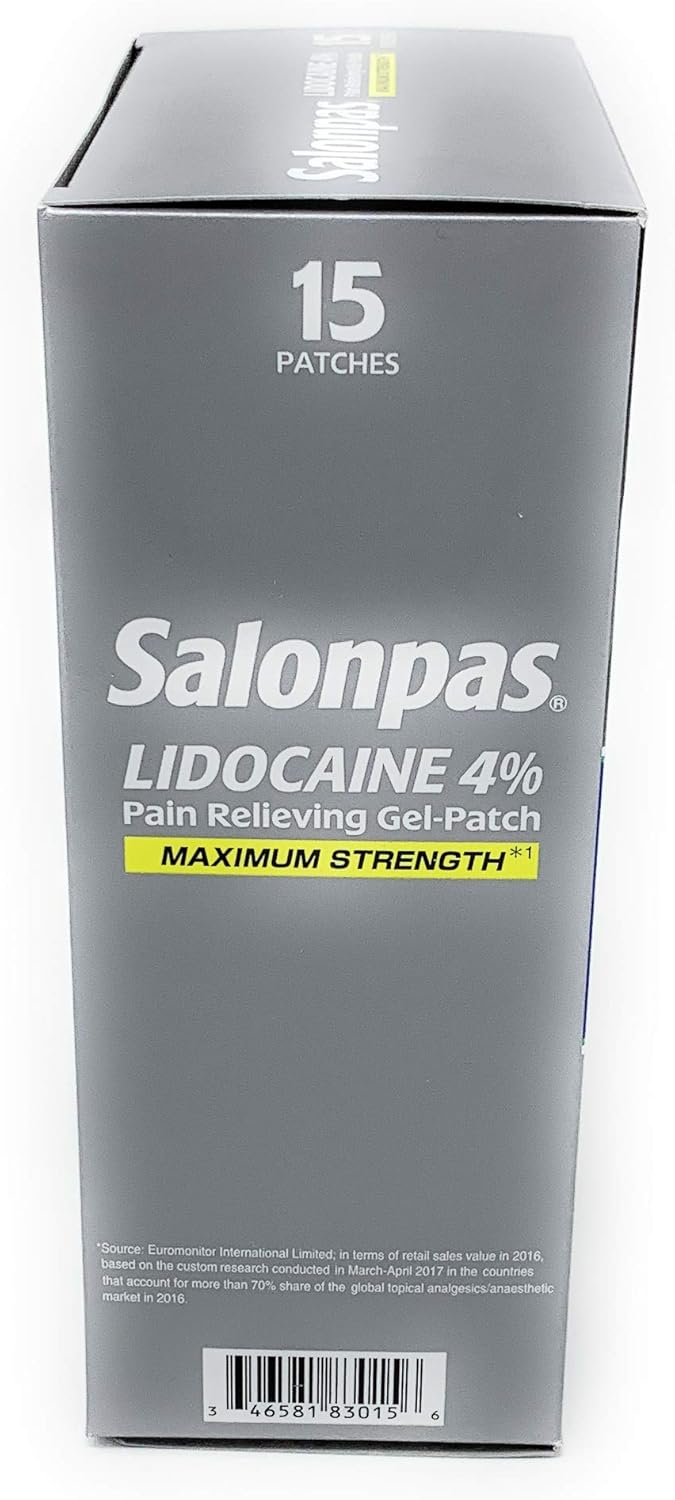 Salonpas is the World's No.1 OTC Topical Analgesics Patch Brand3. With 80 years of experience in topical analgesics, Salonpas provides innovative and effective over-the-counter products to millions of pain sufferers around the world. Topical anesthetic patches, like Salonpas LIDOCAINE 4% Pain Relieving Gel-Patches, are a great alternative to gels or creams. Patches are portable, convenient and apply without any mess. When applied properly, Salonpas patches stay in place and can be worn easily under clothing. Try Salonpas LIDOCAINE 4% Pain Relieving Gel-Patches the next time you have pain.