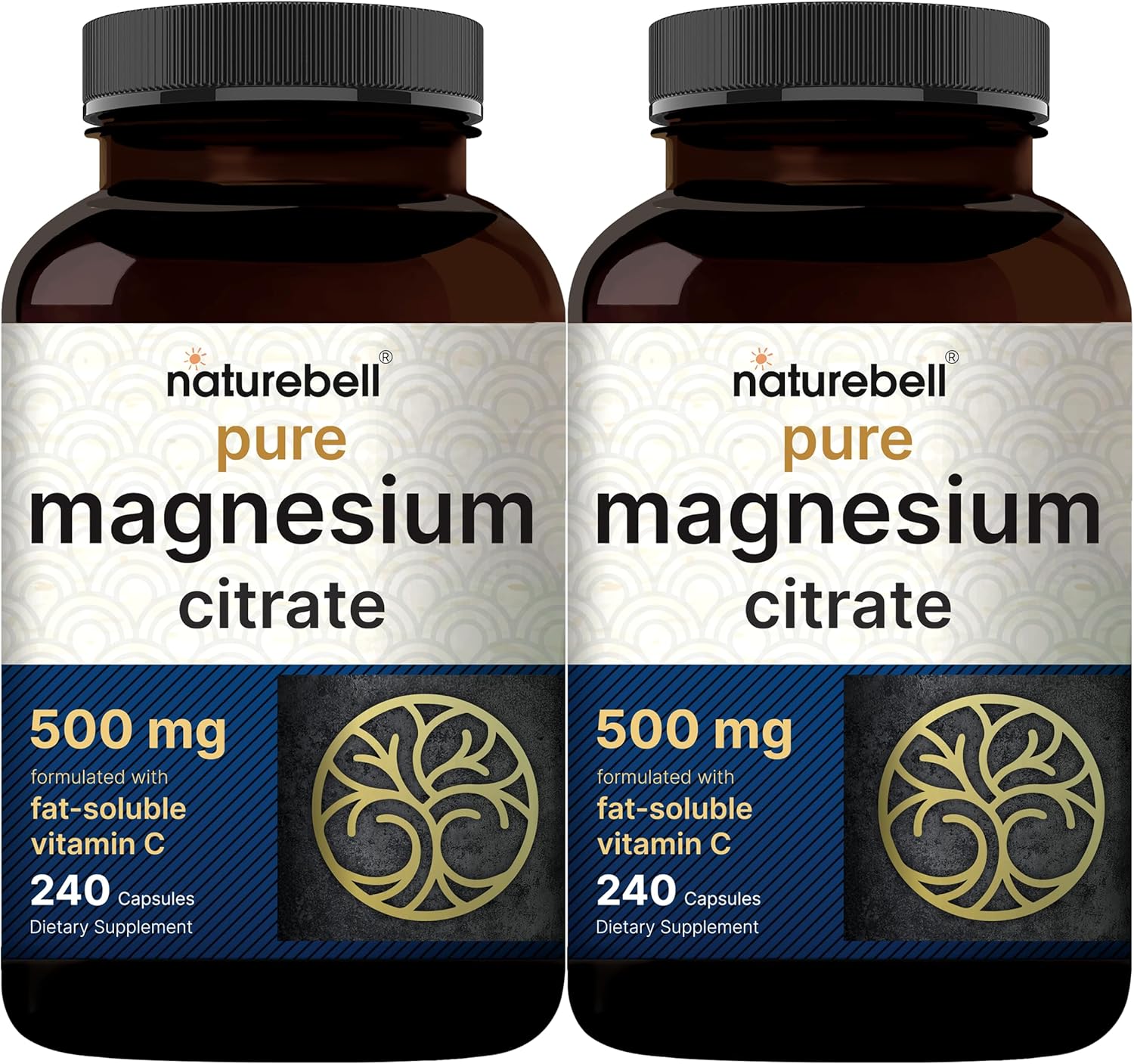 High-potency magnesium citrate capsules combined with fat-soluble vitamin C for dual-action support from essential minerals and vitamins. Features a bioavailable form that’s easy on the stomach and made without fillers. 2 pack with each bottle containing 240 capsules with a 3-capsule serving, delivering 500mg of magnesium and 108mg of vitamin C (as ascorbyl palmitate) for a combined supply of 160 servings. Magnesium supports over 300 functions in the body and may help replenish natural levels over time. Includes vitamin C for added antioxidant protection. Authentic non-GMO magnesium citrate powder capsuled supplements. Contains pure ingredients free of fillers, soy, dairy, gluten, wheat, eggs, and tree nuts. All products are 3rd party lab tested for safety and potency.