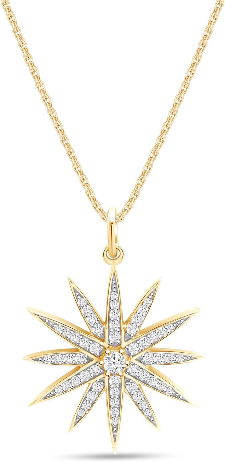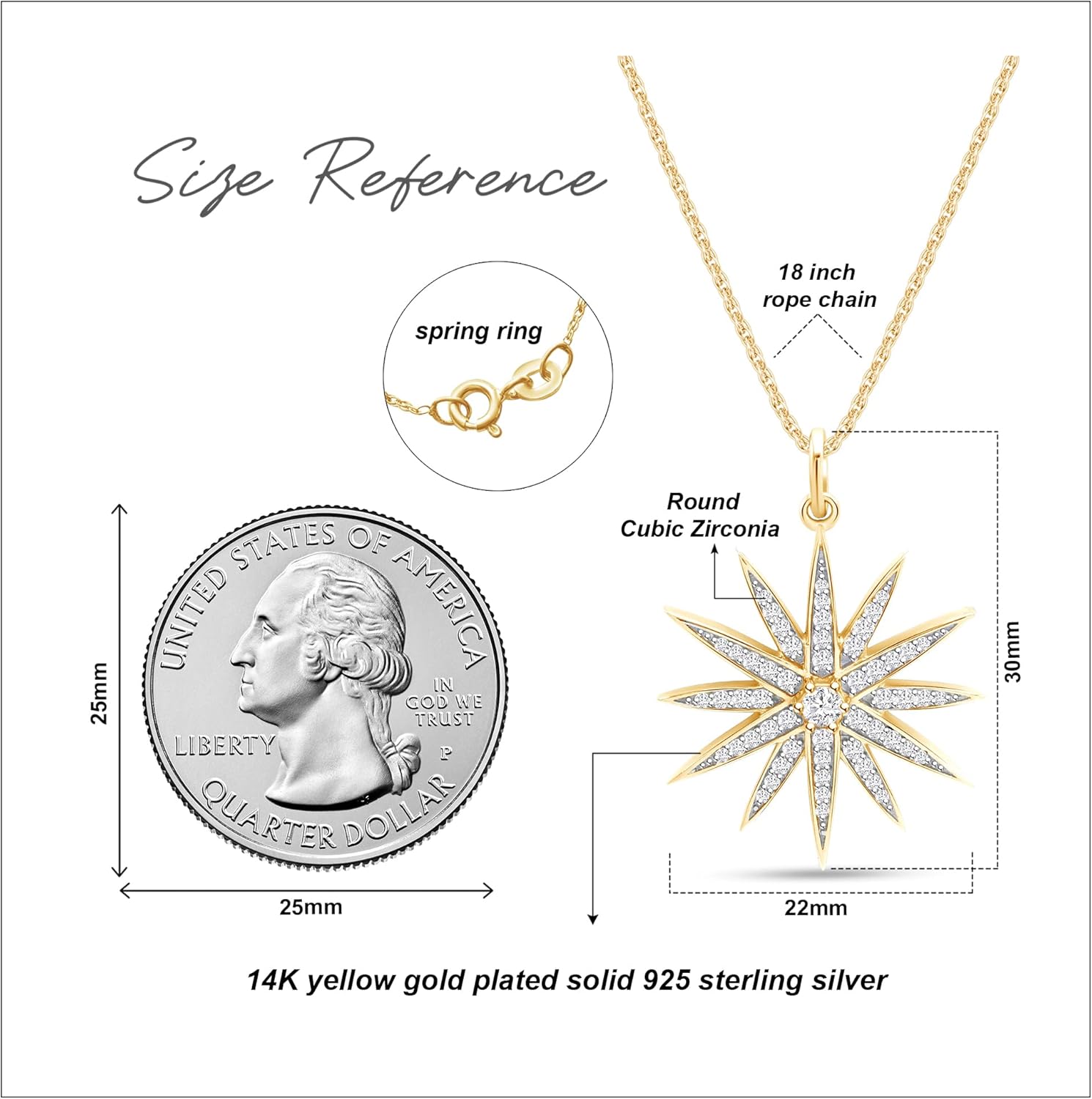 Starburst Pendant Necklace for Women with Round Cut Cubic Zirconia OR Lab Created Moissanite 0.40 Cttw In 14K Gold Plated Sterling Silver Jewelry Along With 18" Chain Gift For Her