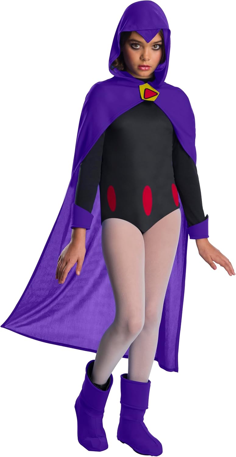 Transform into the mystical Raven with the DC Teen Titans Go! Raven Deluxe Costume for Kids by Rubies! This soft, stretchy long-sleeve leotard offers a snug, comfortable fit for all-day adventures. The bold purple and black design captures Raven’s iconic look from the series and movie. A flowing hooded cape adds mystery and power, while boot-style shoe covers complete the outfit. Perfect for Halloween, parties, or cosplay, this costume lets your child channel Raven’s magical aura with style and confidence. Whether battling villains or striking a pose, they’ll feel smart, powerful, and ready to join the Teen Titans in every heroic mission! Since 1951, Rubies has been a trusted name in fun, offering safety-tested costumes, wigs, masks, and accessories for kids, adults, pets, and décor. Now part of a global family of brands, Rubies delivers both licensed and original styles designed with quality, comfort, and creativity in mind. From Halloween to everyday play, our wide assortment helps bring imagination to life with on-trend looks and iconic characters. With over 70 years of experience, Rubies continues to inspire unforgettable moments for the whole family—year-round.