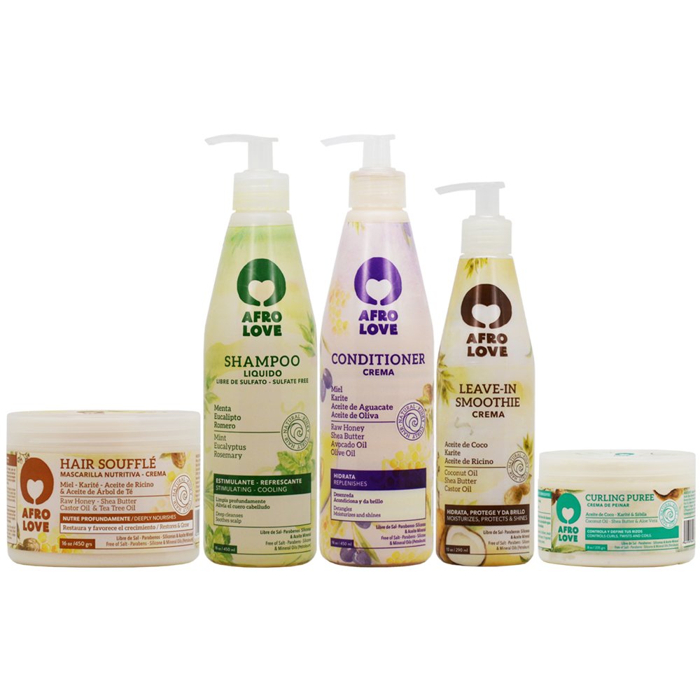 Afro Love Completo Set de Cuidado Capilar, Champú (16oz), Acondicionador (16oz), Hair Soufflé (16oz), Crema Leave-In Smoothie y Purea de Curls (8oz), Libre de Sulfatos y Parabenos Para Cabello Curly, Kinky y Coily