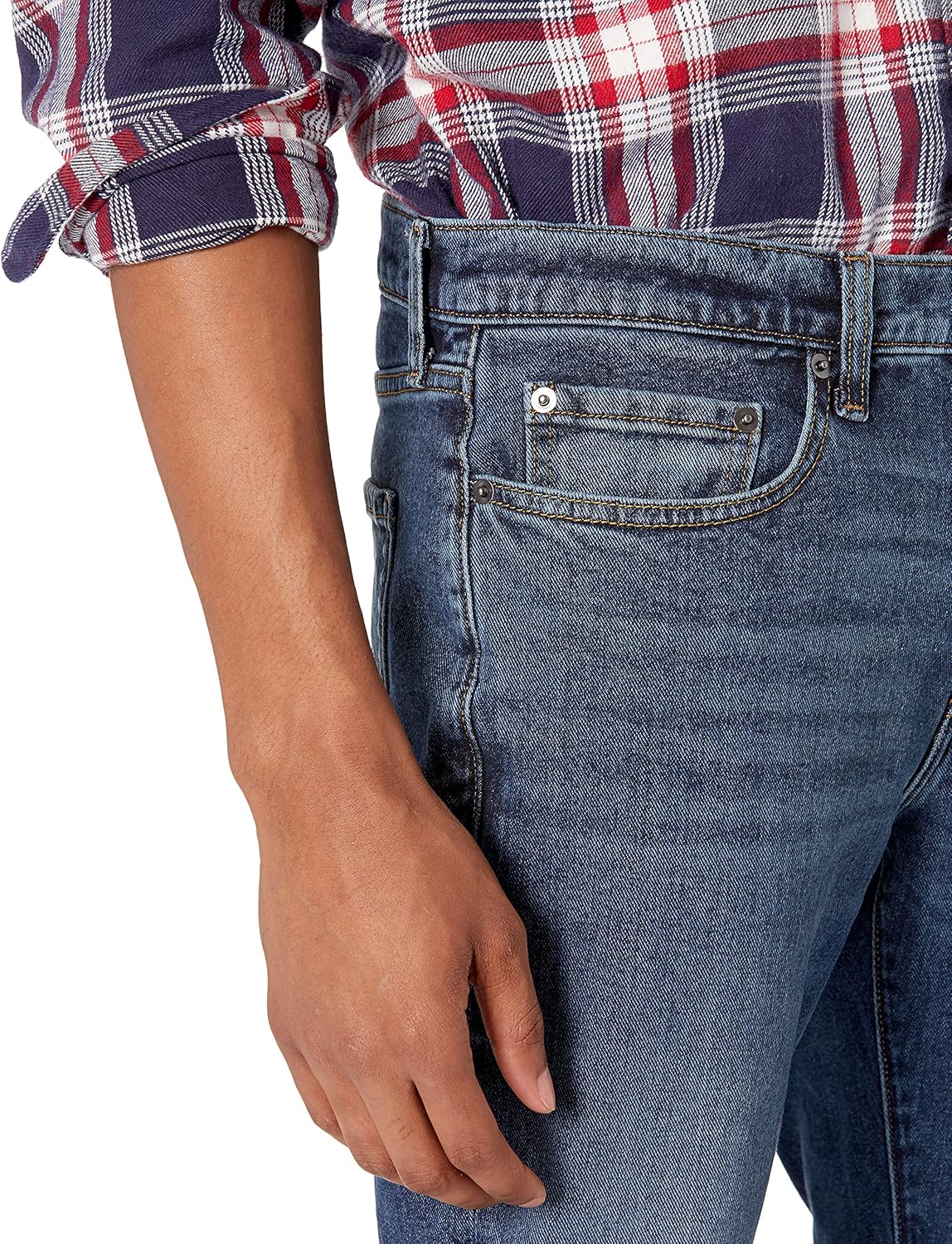 Crafted from mid-weight cotton denim, these blue jeans for men incorporate a light-stretch fabric, providing all-day comfort. The classic design includes five pockets, a zippered fly, metal button closure, bartack reinforcements, and rivets at the front hand pockets. With a variety of denim washes and solid colors, these Amazon Essentials men's slim jeans offer men's clothing that combines affordability and high standards.