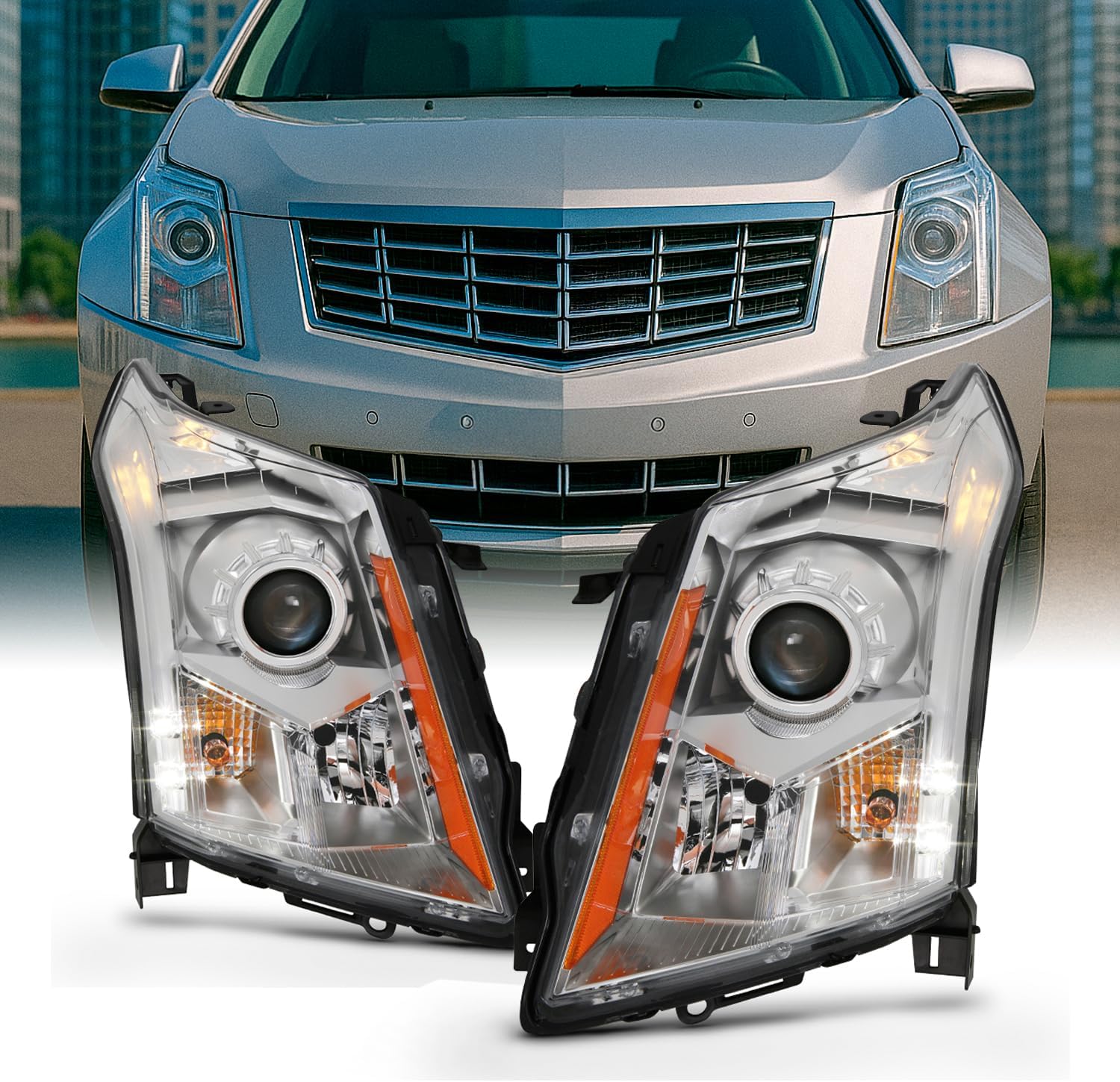 This is a 100% brand new pair of Headlights Replacement Assemblies in Polished Chrome Housing With Crystal Clear Lens Compatible With: 2010-2016 Cadillac SRX ***Compatible Models w/ Factory Halogen Headlights Only*** ***Not Compatible Models w/ Factory HID/Xenon Headlights***