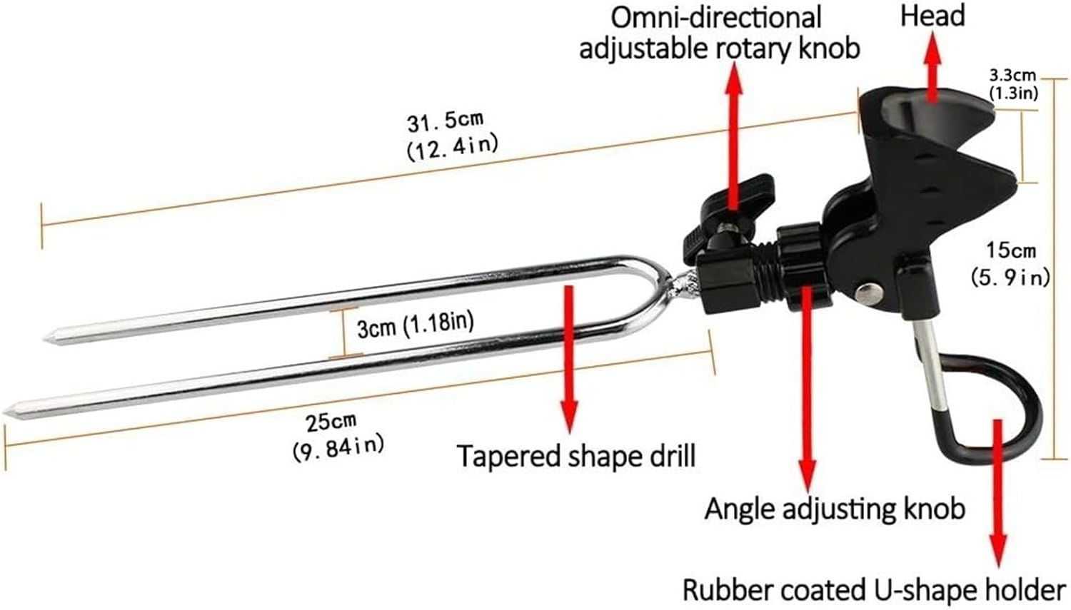Omni-directional adjustable rotary knob, loos the nut to make 360°rotate the head and fix to the direction you wanted, designed for compact folding, small packed, ideal for store and transport UNIVERSAL FIT: 1.3" width, enough to adapting to general most rods like spinning, casting and spincast rod Tapered shape drill rod construction easily goes into mud, sand, rock cracks and stands sturdy and strong, rubber coated U-shape holder, prevent your fishing rod from slip away and protect your rod to avoid scratching Just set your rods off the ground and wait for bite, fish in ease and relax. Quality aluminum casting process and ABS plastic construction, light-weight as well as durable and never rust Notes: The bank fishing rod holder is required to be tested with fishing pole. There is the video on the left of the product page to show how to test of the holder.