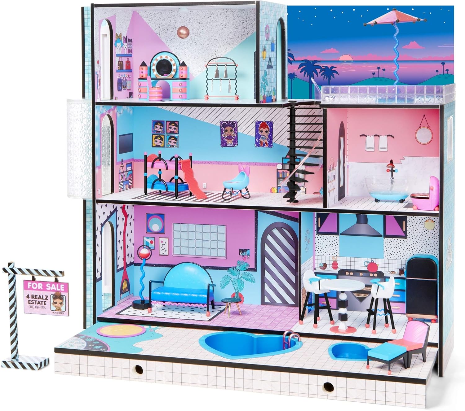Características interactivas que incluyen ascensor en funcionamiento, luces y sonidos en los tres pisos; piscina real, spa y caja de arena