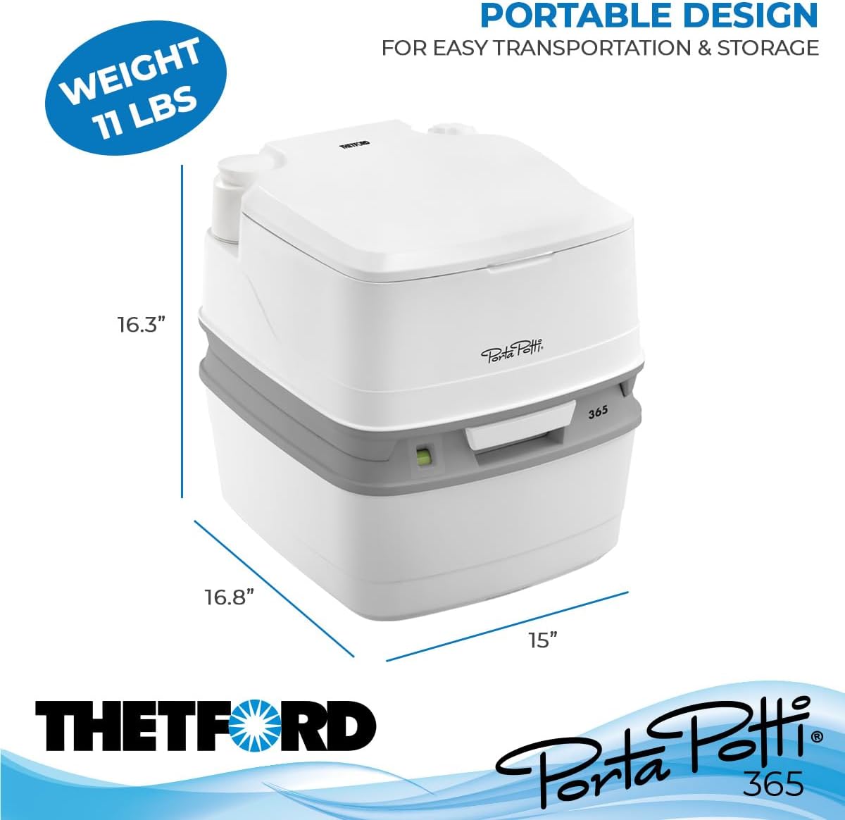 ¡El Thetford Porta Patti 365 es el inodoro portátil original y mejor! Cuenta con un aspecto moderno y una apariencia renovada y un rendimiento líder en la industria con un exclusivo mecanismo de vaciado giratorio. El mango ergonómico facilita el transporte del Porta Patti 365. Capacidad de agua fresca: 4,0 galones. Capacidad de agua residual: 5,5 galones.