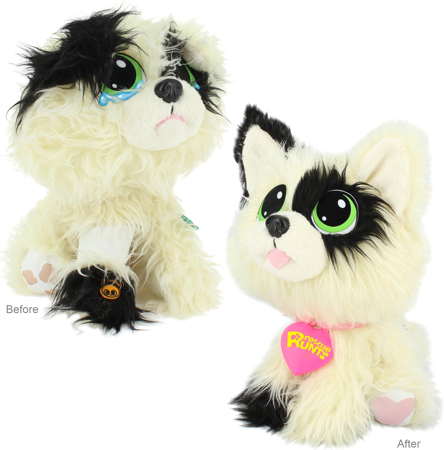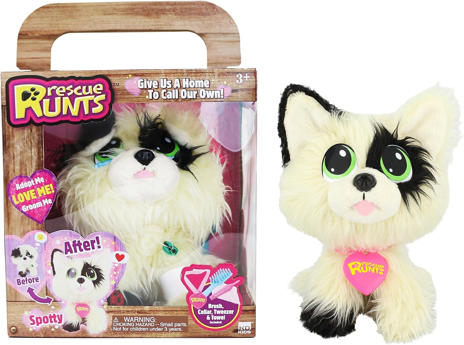 Rescue Runts are adoptable pets that you rescue, groom & love! these Super soft plush puppies need love and care to go from ragged Runts to perfect pets! Rescue Runts arrive on your doorstep with matted fur, dirty paws, bandages and Fleas. Care for your rescue runt using the included tweezers, towel and brush to remove their Fleas, wipe away their tears, clean their paws and comb their fur. Remove their bandages and perk up their ears to complete the transformation! choose a name to write on the collar to make the adoption official. Rescue Runts’ messy fur, downturned ears, dirty paws and bandages can be restored for repeated animal rescue play. Give us a home to call our own!
