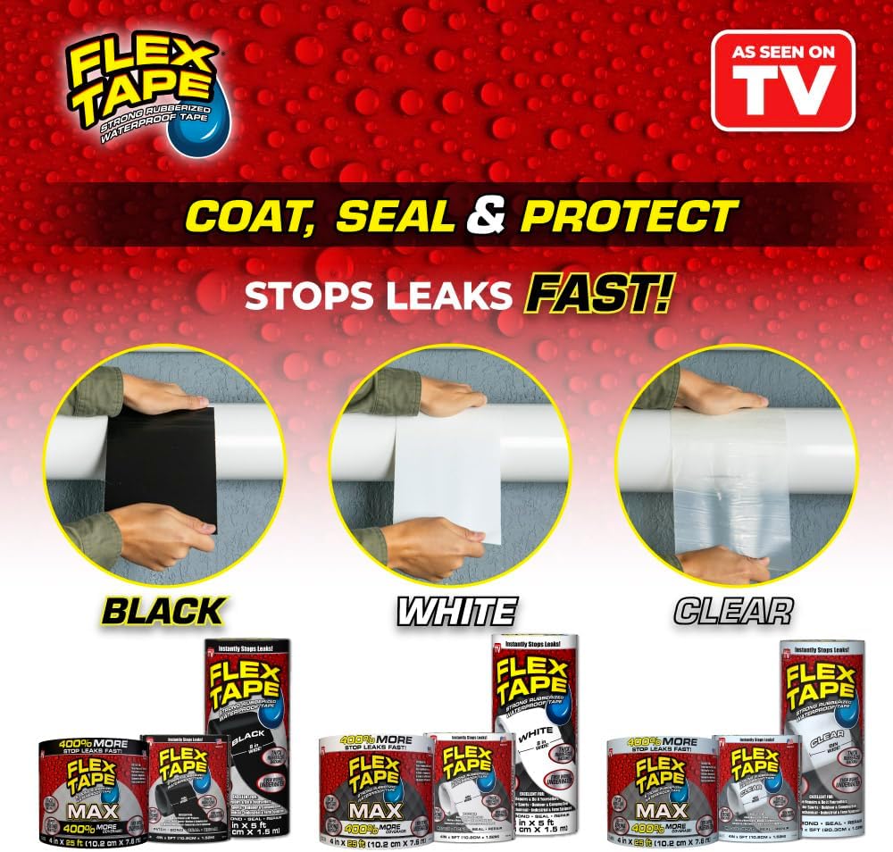 Flex Tape es una cinta súper fuerte, de caucho, hidrorresistente que puede reparar, unir, sellar y arreglar prácticamente todo. Flex Tape se sujeta firmemente y se une instantáneamente. ¡Es tan fácil de usar para cualquier emergencia! Y es tan fuerte que incluso funciona bajo el agua. La unión de Flex Tape aumentará con el tiempo y la presión. USAR EN: PVC, acrílico, metal, acero, cobre, aluminio, madera, cerámica, porcelana, azulejos, vidrio, caucho, fibra de vidrio, estuco, yeso, piedra, cemento, hormigón, tabique, techos EPDM, algunos plásticos, telas, vinilo y mucho más! ¡Viene en negro o blanco para todas tus necesidades! EXCELENTE PARA: Fugas de techos, canalones, bajantes, botes, kayaks, embarcaciones acuáticas personales, canoas, equipos para exteriores, casas móviles, RV y caravanas, tuberías de PVC y plomería, sistemas de riego, piscinas y spas, ventanas, puertas, paredes, juntas, conductos de aire, HVAC crea una súper fuerte sellado impermeable, proyectos de bricolaje y mucho más!