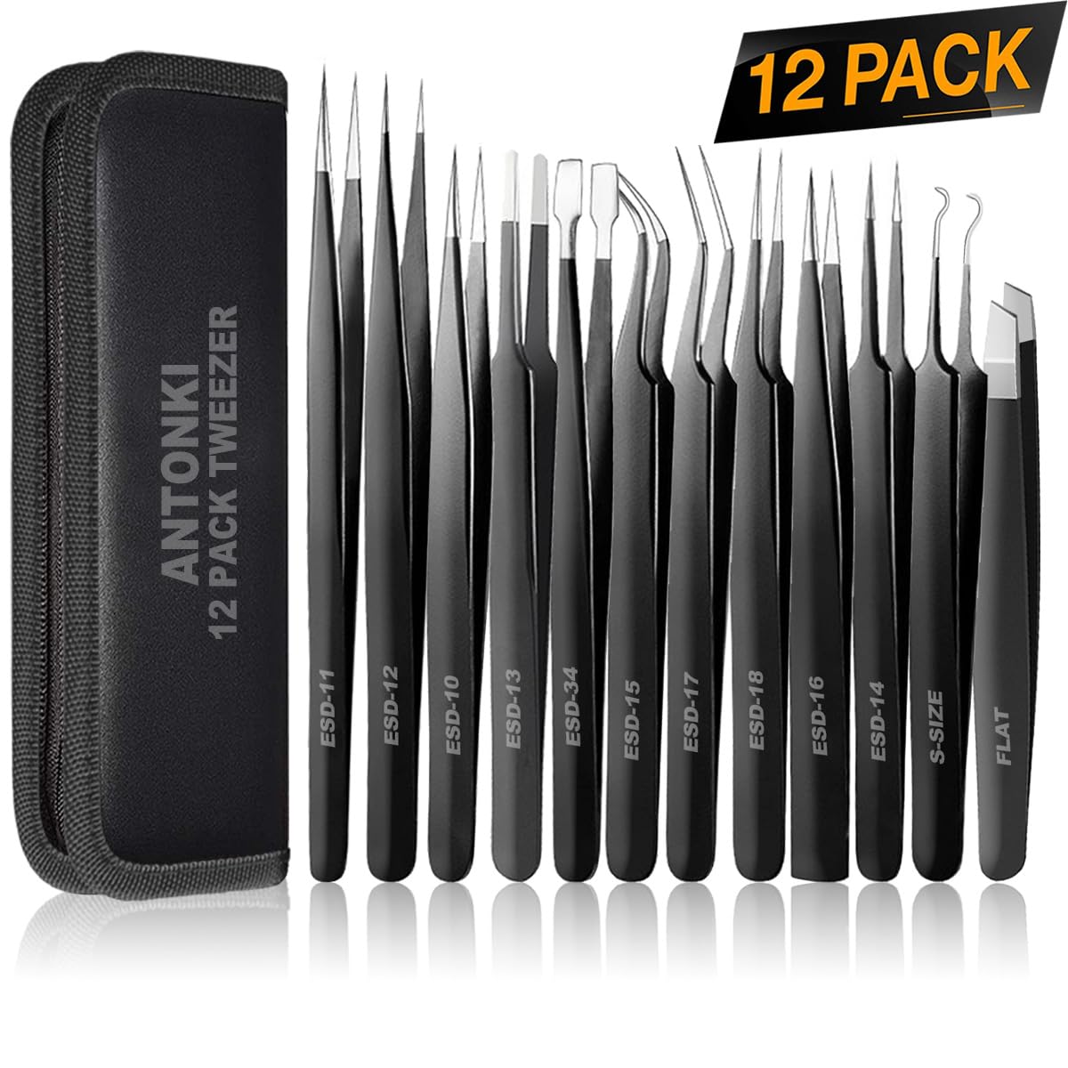 Antonki 12 Pack Precision Tweezers Set for Craft, Soldering, Jewelry, Facial Hair, Eyebrow, Ingrown Hair Removal, Eyelash Extension- with Case