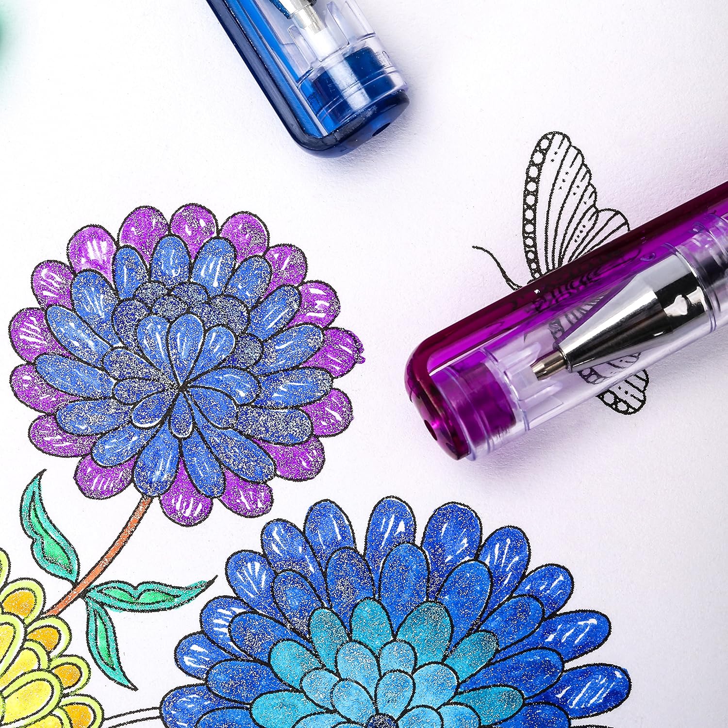 The magic of coloring I will share a little secret about coloring. Coloring with Caliart glitter gel pens is a great way to release stress and chronic pain. Coloring at any time of day will place you in a balanced mindset and help you transition to work or sleep. With technology taking so much of our time and focus, reconnecting with the simple things we enjoyed as children is a way to be more present and mindful. So turn off the machines and get coloring today! Your Question & Our Answer Are they ALL glitter? - Yes. They are all glitter . What's the tip size of these pens? - The tips are 1.00mm. Do they show up on the black paper? -Yes. All our glitter pens can show their bright color on the black and white paper. Especially the neon glitter colors. Have more question? - Ask us immediately and tell us your suggestion. What You Can Get: 120 Glitter Gel Pens - No Duplicated PVC Case - Durable & Beautiful Few Tips: First, leaving the protective caps off gel pens can lead the ink inside to dry quickly, so remember to cap them after using them. Second, some liquid may be stock due to weather(specially the winter),we can just shock it a little bit before using.