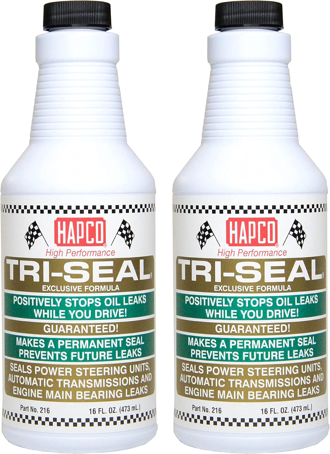 Hapco Tri-Seal positively stops leaks in all engines, transmissions and power steering units. This exclusive formula revitalizes the flexibility, elasticity and tensile strength of rubber seals to original condition and also helps prolong the life of all seals to prevent future leaks. Does not contain petroleum distillates, which can harm or destroy seals, and is 100% non-clogging. Tri-Seal is compatible with all manufacturers’ fluids and has a proven history of success since 1960. FOR BEST RESULTS: With engine off, add one bottle of Tri-Seal to the engine, transmission or power steering fluid reservoir at any time (or 2 oz. per quart capacity). Drive vehicle as normal to allow circulation of fluids. Most leaks are repaired in as little as 2 hours of total fluid circulation (or 1-2 days of normal driving). After the leak is repaired, Tri-Seal can remain in the system until mileage indicates need for oil / fluid change. Tri-Seal is also safe to use in: hydraulic systems (jacks / cylinders / pumps), marine engines, differentials, rear axles, refillable shock absorbers, gear cases, reduction gears, transfer cases and pillow blocks.