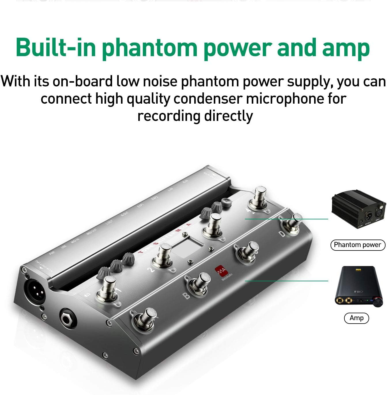 Variedad de entradas: TS Mega tiene entrada L para guitarra/bajo, entrada R para micrófono dinámico y una entrada XLR para micrófono de condensador. La entrada L tiene integrado un módulo de refuerzo de guitarra analógico, el módulo ayuda a mejorar el tono de la guitarra. La entrada R está diseñada para micrófonos dinámicos. La entrada XLR es perfecta para micrófonos de condensador. Puede proporcionar alimentación fantasma de 12 V de bajo ruido para el micrófono de condensador.