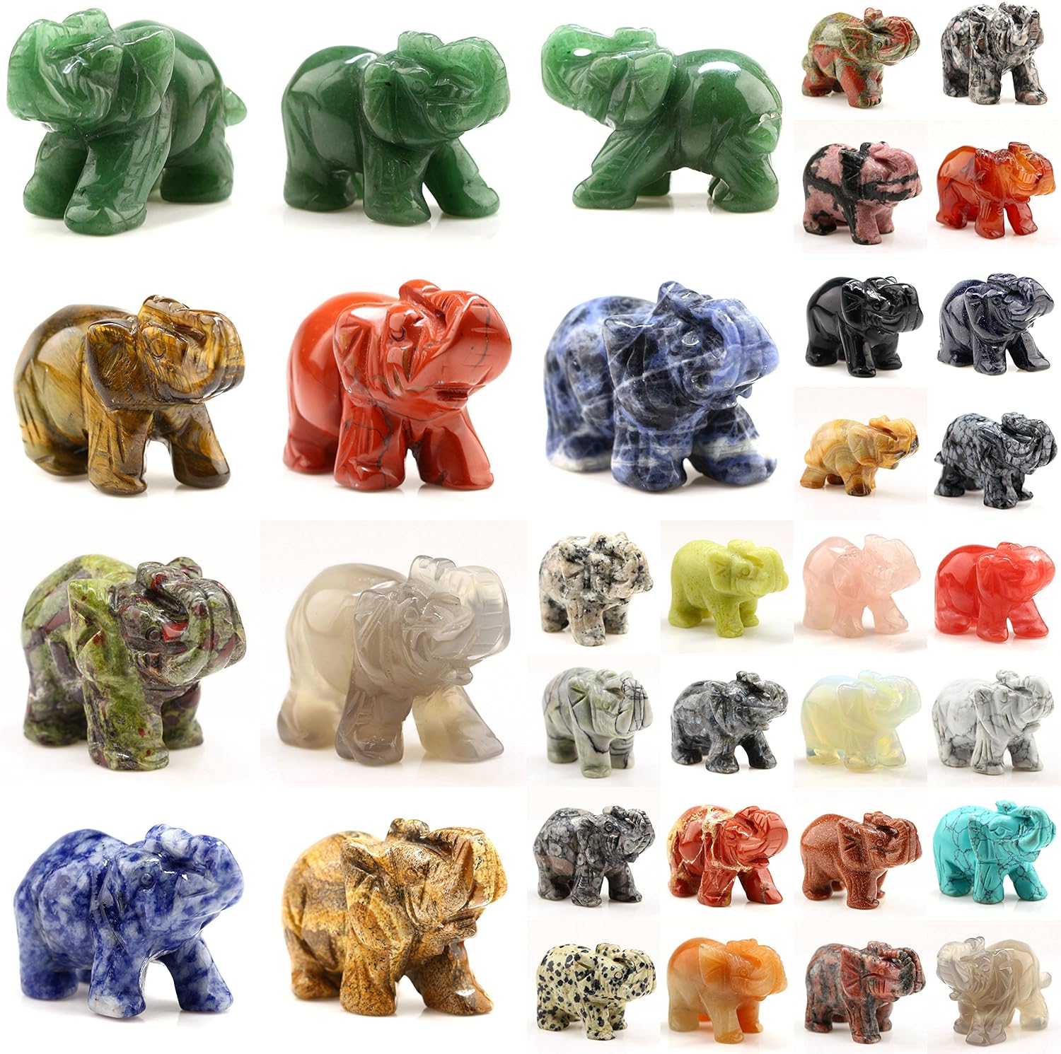 1.5 inches healing crystal stones elephant figurines statues Product features: Weigh about 0.07ib or 1.06oz. Package include 12pcs elephant figurines. Easy to clean and wash by towel with cold water. Suitable for office, collecting, gifts, study, jewelry, massage, healing, decor,figurine. Natural crystal elephant pocket gemstone statue is a symbol of luck, wisdom, health and loyalty. It can bring you peace,fortune,and endless positive energy. Also, healing elephant quartz figurine serves well as a home decoration or a perfect gift for your friends and yourself. A good gift choice for birthday, father's day, mother's day, moving to a new house, etc. Kind Reminder: Each crystal elephant statue is unique. Due to hand-making, the size, color and shape of the crafts may be slightly different, so is subject to the actual product received. Please know that the selection is random, you will received 12 different material elephant figurine. Package include:12pcs elephant figurines.