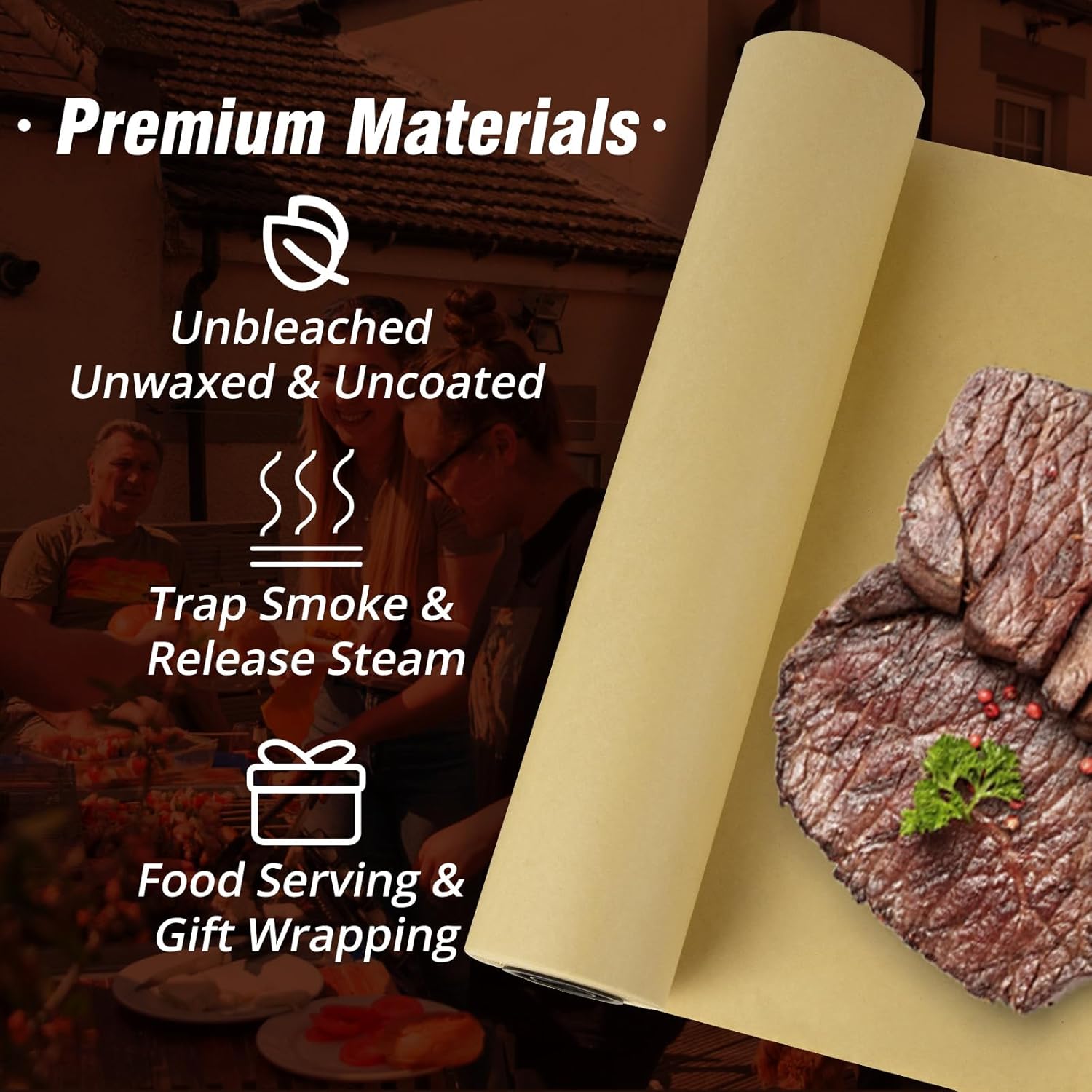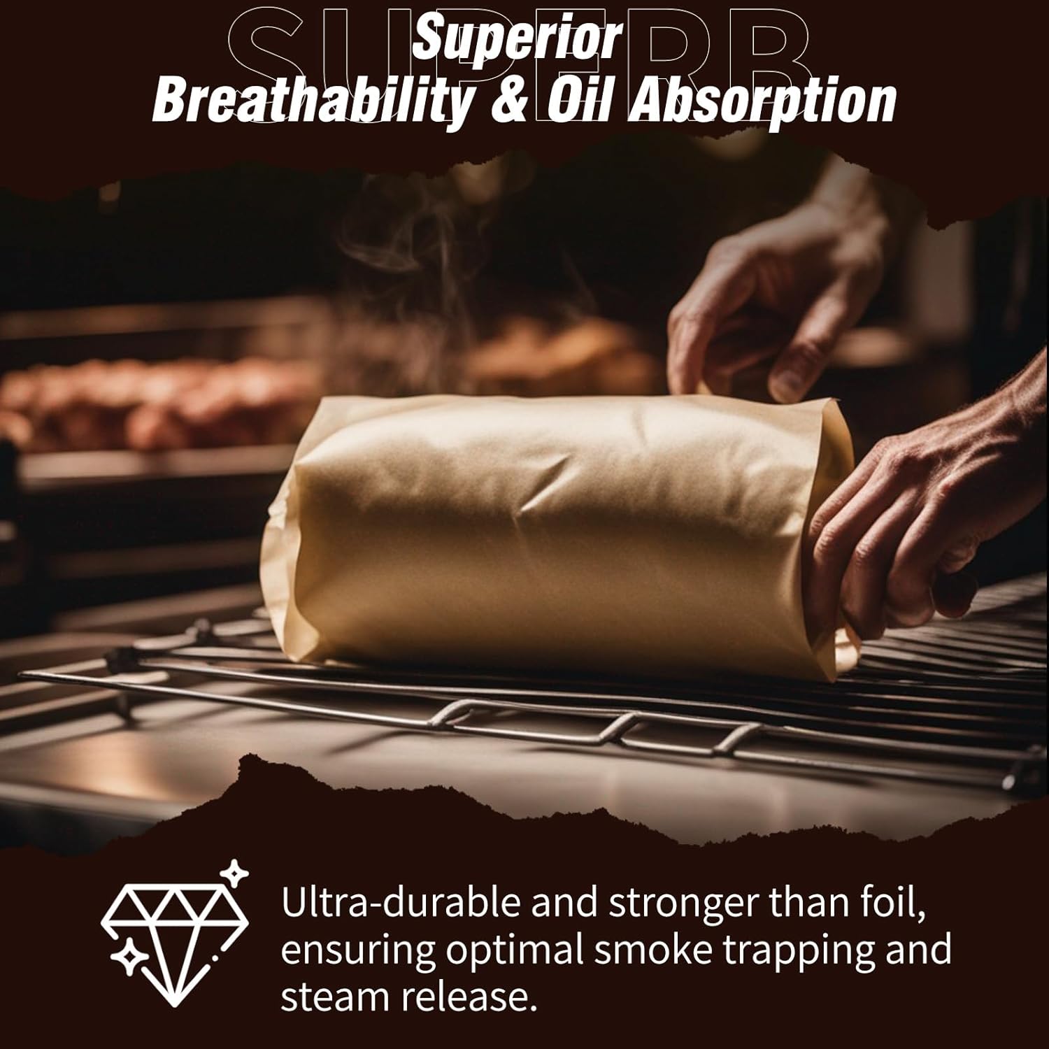 【PAPEL DE 40 NÚMEROS, FUNCIONA MEJOR QUE EL PAPEL DE ALUMINIO】El gramaje base estándar es de 40 números, ultrarduradero y resistente. Este papel es más resistente que el papel de aluminio y atrapa mejor el humo a la vez que libera vapor para evitar que los alimentos se empapen. Está diseñado para alimentos, perfecto para ahumar, asar carnes o envolver carnes recién cortadas.