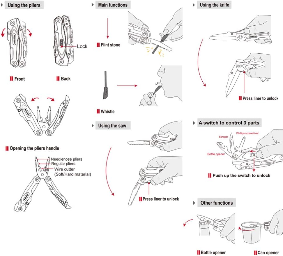MECANISMO DE BLOQUEO: Mecanismo de bloqueo independiente, todas las herramientas se bloquean perfectamente en su lugar. 14 funciones en 1, incluye sierra, cuchillo, abridor de latas, abridor de botellas, destornillador plano, destornillador en cruz, alicates de punta fina, alicates normales, cortadores de cable (material suave/duro), piedra de chispa, silbato, taladro, raspador y punzón.
