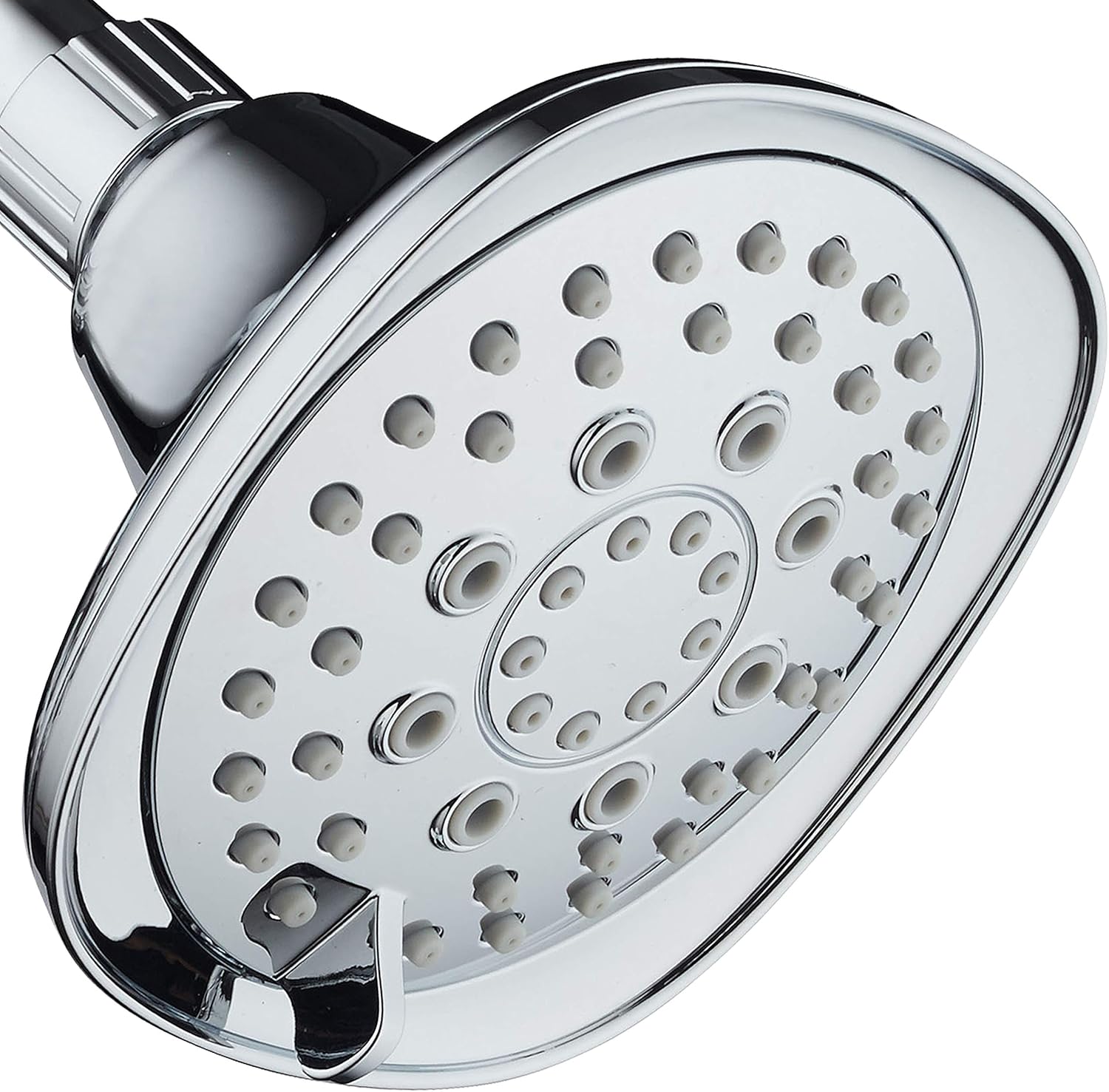 Hot Oval Square Style! 6-setting High-Pressure Luxury Shower Head . Angle Adjustable, Solid Brass Connection Nut, All-Chrome Finish. Premium Quality Exclusive Showerhead from Top American Manufacturer. OUR U. S. DESIGNED SHOWERS offer the latest in high-pressure shower technology, providing far superior shower performance than cheap, outdated Chinese showerheads sold by most resellers. The difference can be especially felt under low water pressure. Six luxurious settings feature Power Rain, Pulsating Massage, Gentle Mist, Water-saving ON/OFF Pause and two mixed modes. OVERSIZE 4. 3" CURVED-SURFACE FACE dramatically widens flow trajectory for extra flow coverage as Angle-adjustable Ball Joint provides perfect flow angle. Anti-clog Self-clean flexible nozzles resist calcium buildup to stay clean and clog-free for superior flow performance with less cleaning and maintenance. FASHIONABLE OVAL SQUARE DESIGN offers sophisticated, upscale transitional look that never goes out of style. 100% Stain-resistant All-chrome Finish is not to fade, chip or peal off. EASY TOOL-FREE CONNECTION with just one hand-tighten joint fits any standard shower arm. Solid Brass Ball Joint provides reliable leak-free connection that will not leak, strip or crack. Screen Washer and Plumber's Tape included. OUR EXCLUSIVE AAA LIFETIME is backed by our U. S. Customer Care Center with immediate assistance from trained U. S. shower experts by phone or email.