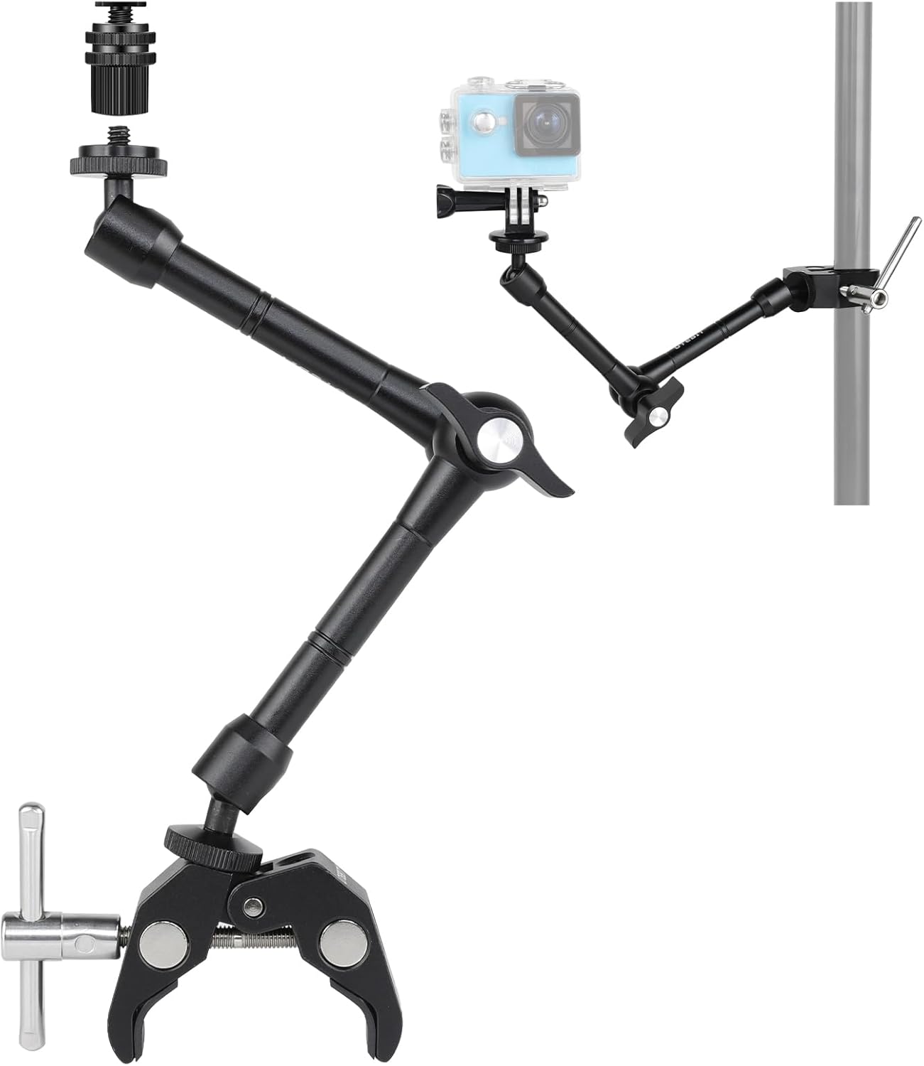 【Versatility and Facility】The Package comes with a super clamp with 1/4" and 3/8" threads and an articulating arm with 1/4” screws on both ends respectively. Easy Installation, No need to drill on the wall or any platform. The unique design of this set allows universal mounting options such as DSLR camera, LCD field monitor, flash light, LED video light and crossbars.