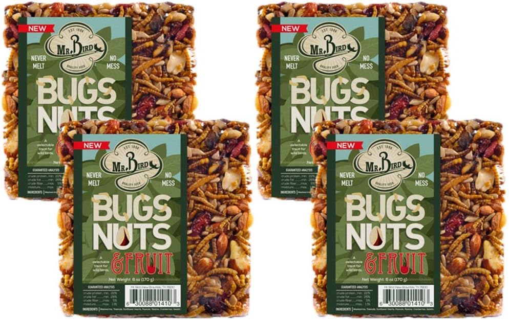 Proudly MADE IN THE USA! Bugs, Nuts & Fruit Block Bugs, Nuts & Fruit A delectable feast for an amazing variety of wild birds. This formula is sure to attract your favorite feathered friends Practical & Easy to Use Easily hang in a block feeder (not included). Long Lasting! Generous size means these blocks will last for days and days, no more running out to refill the feeders constantly. It can't be kicked all over the place like lose seed can. Attracts loads of birds. No waste, no mess, never melt. A Healthy Diet for your Feathered Friends An amazing variety of birds visit these Seed blocks! In addition to the regular feeder birds such as; CardinalsChickadeesWoodpeckersNuthatchesFinchesTitmice We have reports of various Warblers, Wrens, Kinglets, Mockingbirds, and even Bluebirds eating these Seed blocks. What makes this product special is the formula; a fantastic blend of mealworms, pecans, sunflower hearts, raisins and cranberries. BUG APPETIT! You will see the quality and the dramatic results in your own yard. No Waste or Mess Quality ingredients means these seed blocks attract birds much more quickly than suet and without the problem of melting in the summer heat. Great for year-round bird feeding