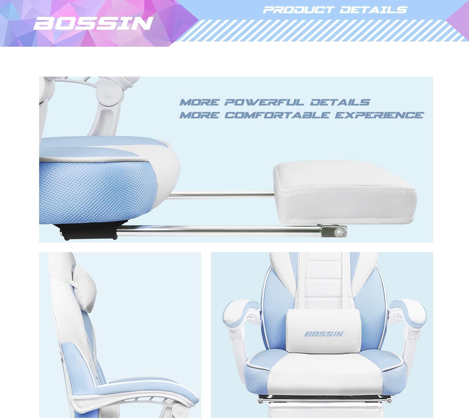 🕹️【Big and Tall Gaming Chair with Footrest】- Liberate Your Feet, Will you feel tired for sitting all the time?Sure.Then you can choose the chair with footrest to relax your feet.When you don’t want to straighten your back and sit,just take out the footrest,put your feet up,turn on your favorite music,and start enjoying the comfort!And don’t worry about clean,it is also made of PU leather,just wipe it with a soft cloth and it will shine as new. 🕹️【Ergonomic Design for Multi-occasion】- Professional design team, Enjoy total lower back support with a built-in, fully adjustable lumbar curve that closely aligns to your spine—ensuring ideal posture for maximum comfort in gaming marathons Stronger metal frame, Thicker cushion, More stable and beautiful design. AWESOME! 🕹️【Reject Short-Lived Chairs】- We never hesitate to apply materials.Armrests must be padded from the position of the elbow to the wrist,built-in metal frame must be wider,and the foam under the leather must be rich,it can’t collapse as if we are sitting on a hard stone when leaning up, skin friendly and wear-resisting PU leather for years of use, high quality filler bring better feels, Class 3 gas lift verified by SGS, durable, this is a gamer chair for adult teens and kids. 🕹️【EASY ASSEMBLE】-The package included everything that you need. All the screws and small parts come attached on a packet clearly labeled. The directions are easy to follow and make sure you follow all steps exactly! Easily and effortlessly. You will get a modern, fashion, comfortable racing chair. 🕹️【WIDE APPLICATIONS 】- BOSSIN gaming chair is an ideal seat of choice for working, studying and gaming. Attractive racing car style makes it perfect for game room or modern office.