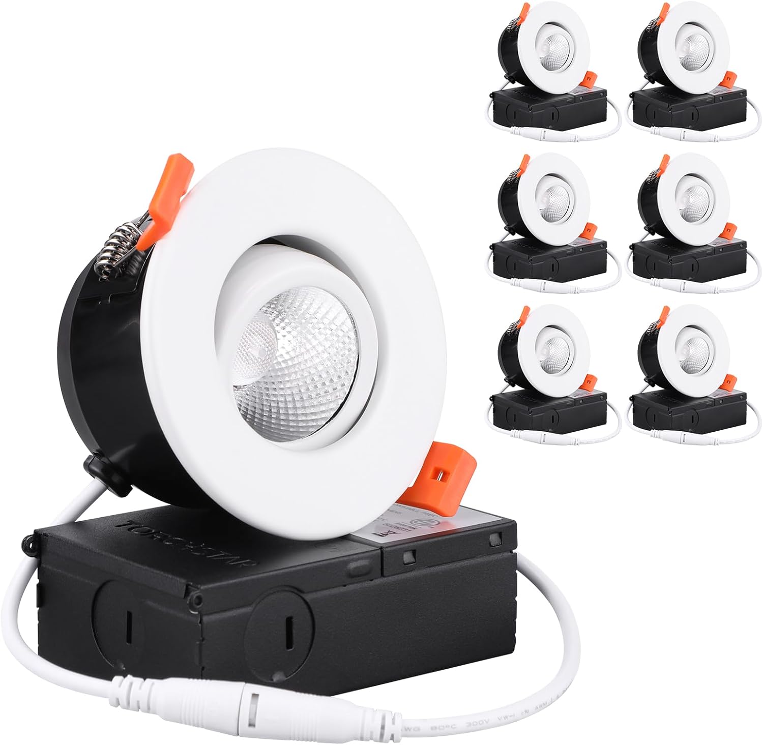 TORCHSTAR 3 Pulgada Luz Empotrada Gimbal LED con Caja de Conexión, CRI 90+ Ajustable Giratorio Downlight Ojo de Buey, 7W (Equivalencia 50W), Luz de Techo LED Sin Carcasa, Blanco Caliente 3000K, Blanco, Paquete de 6
