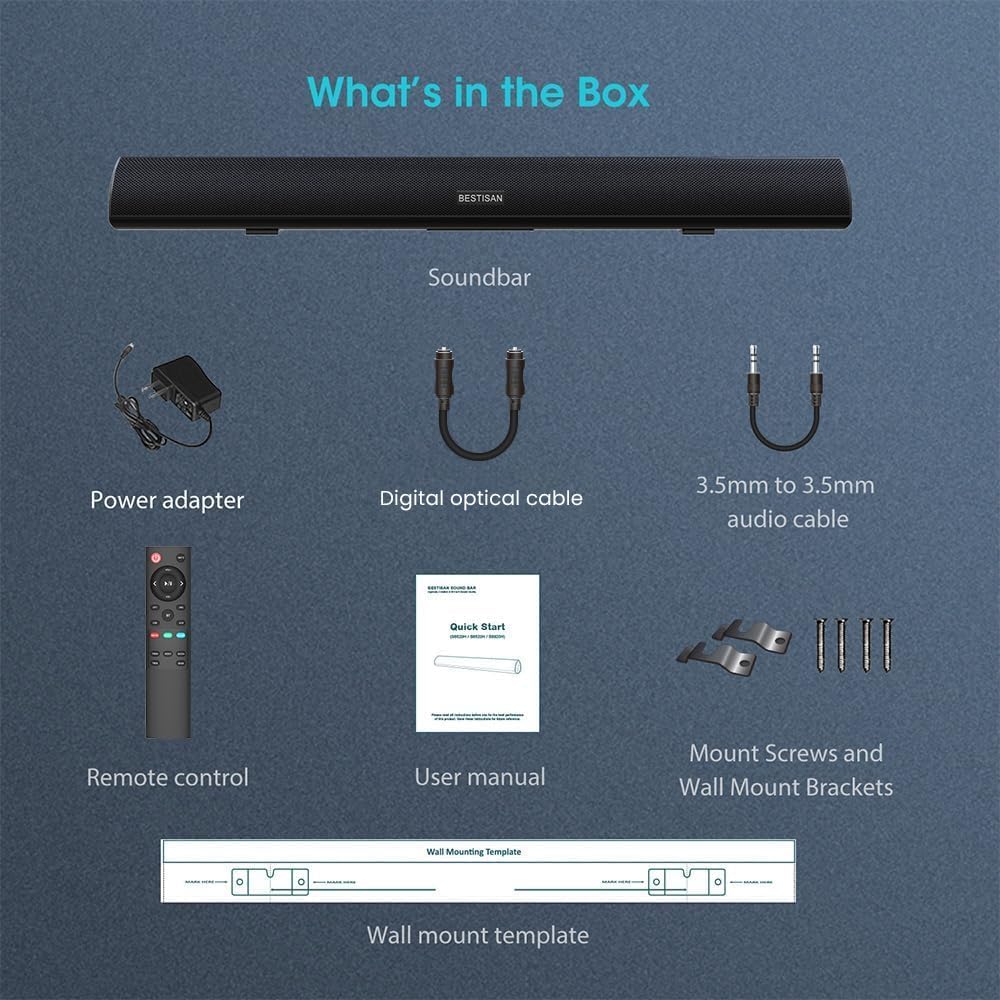 BESTISAN 100 Watt 40 Pulgada Barra de Sonido para TV, Sistema de Cine en Casa Conectado por Cable y Sin Cable (Bluetooth 5.0, 105dB, Audio DSP, Bajo Ajustable, Montable en Pared)