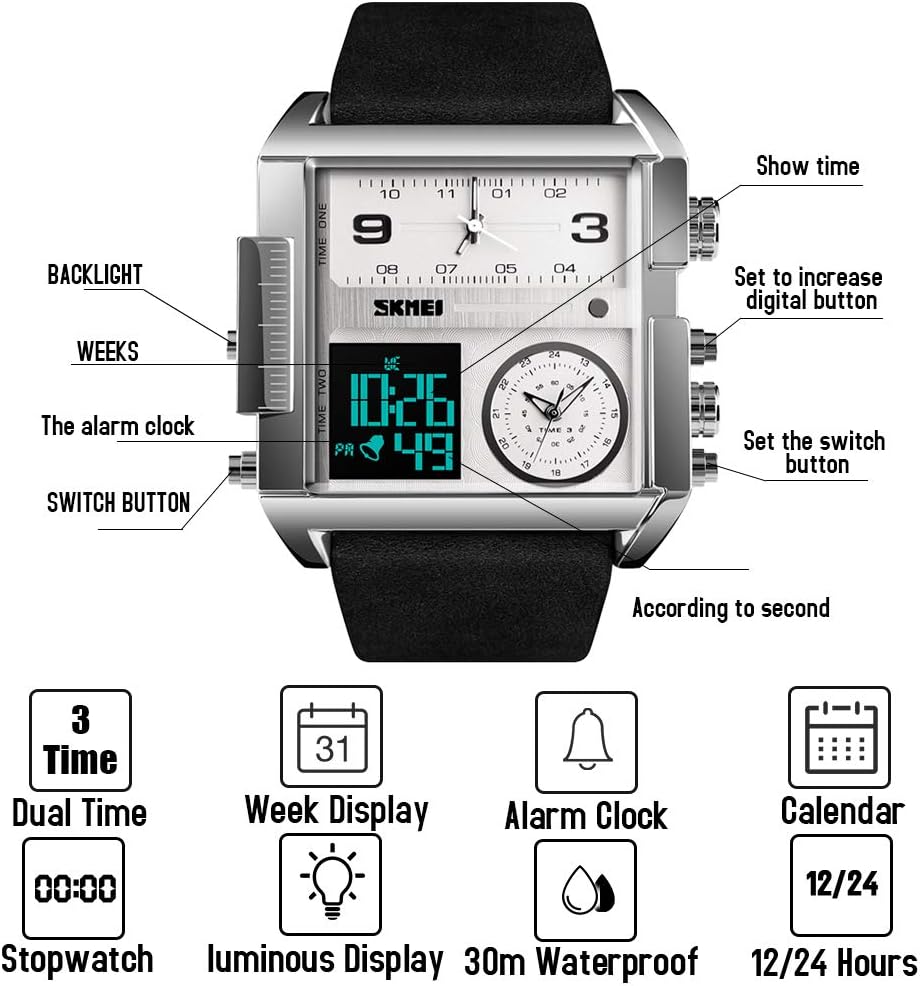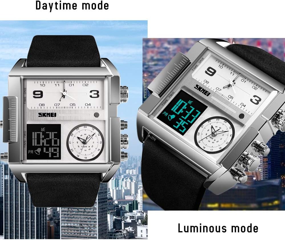 SKMEI Men's Digital Sports Watch, LED Square Large Face Analog Quartz Wrist Watch with Multi-Time Zone Waterproof Stopwatch