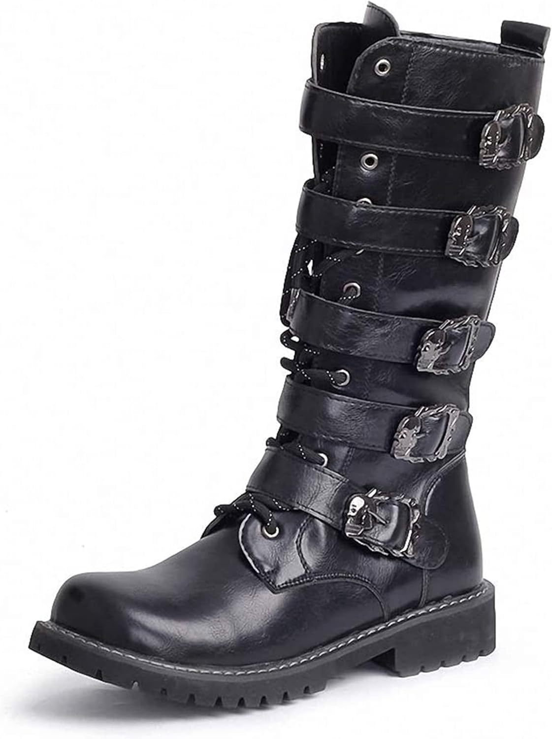 Tebapi - Botas de mochilero para hombre, botas militares altas de combate, con hebilla de metal, punky, media pantorrilla, botas de motocicleta con cordones, zapatos de rock