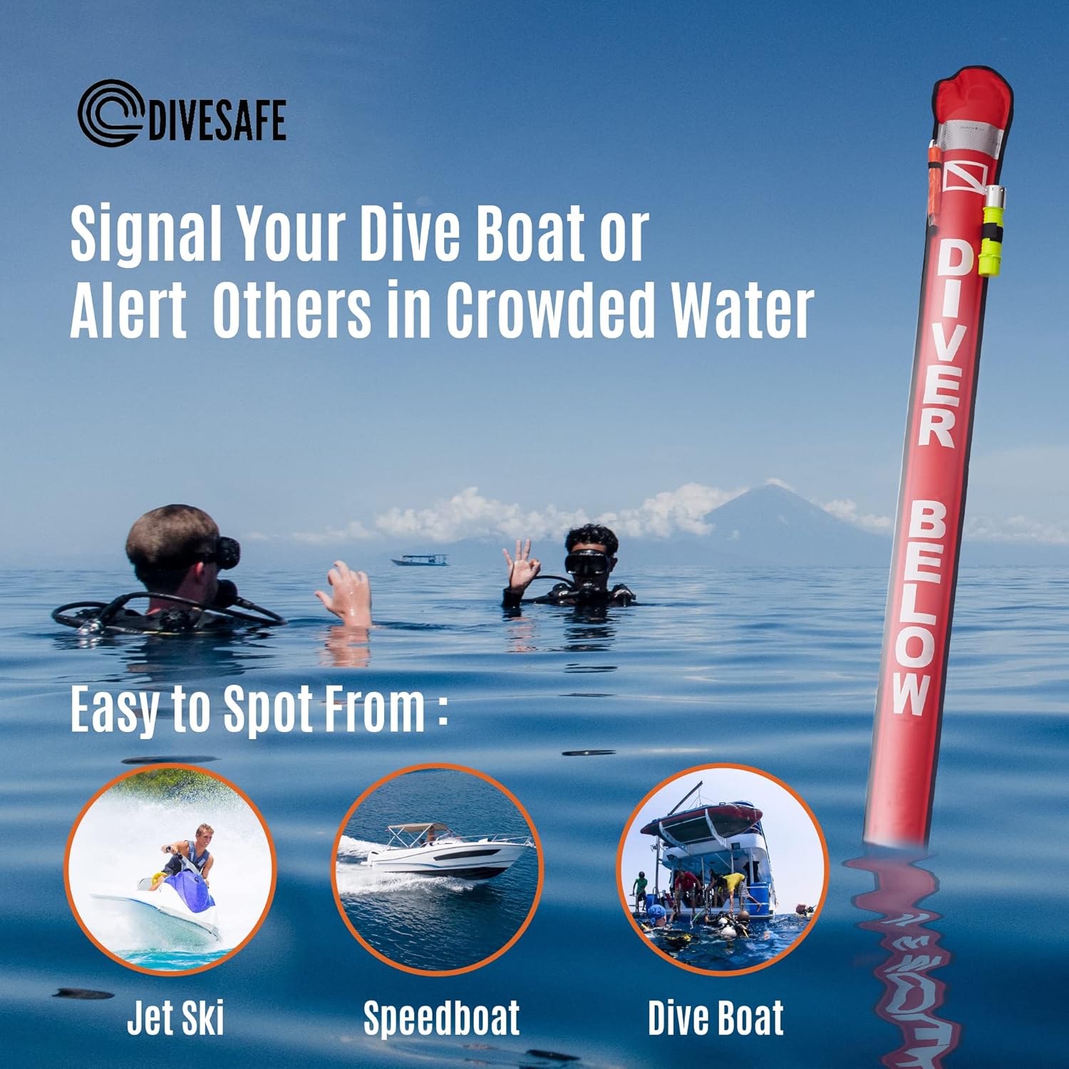 Boya de Marcador de Superficie Diferida DiveSafe – Fondo Cerrado de 7 pies con Banda Reflectante de Alta Visibilidad, Luz Estroboscópica y Soporte para Linterna, Carrete de ABS de 100 pies y Silbador