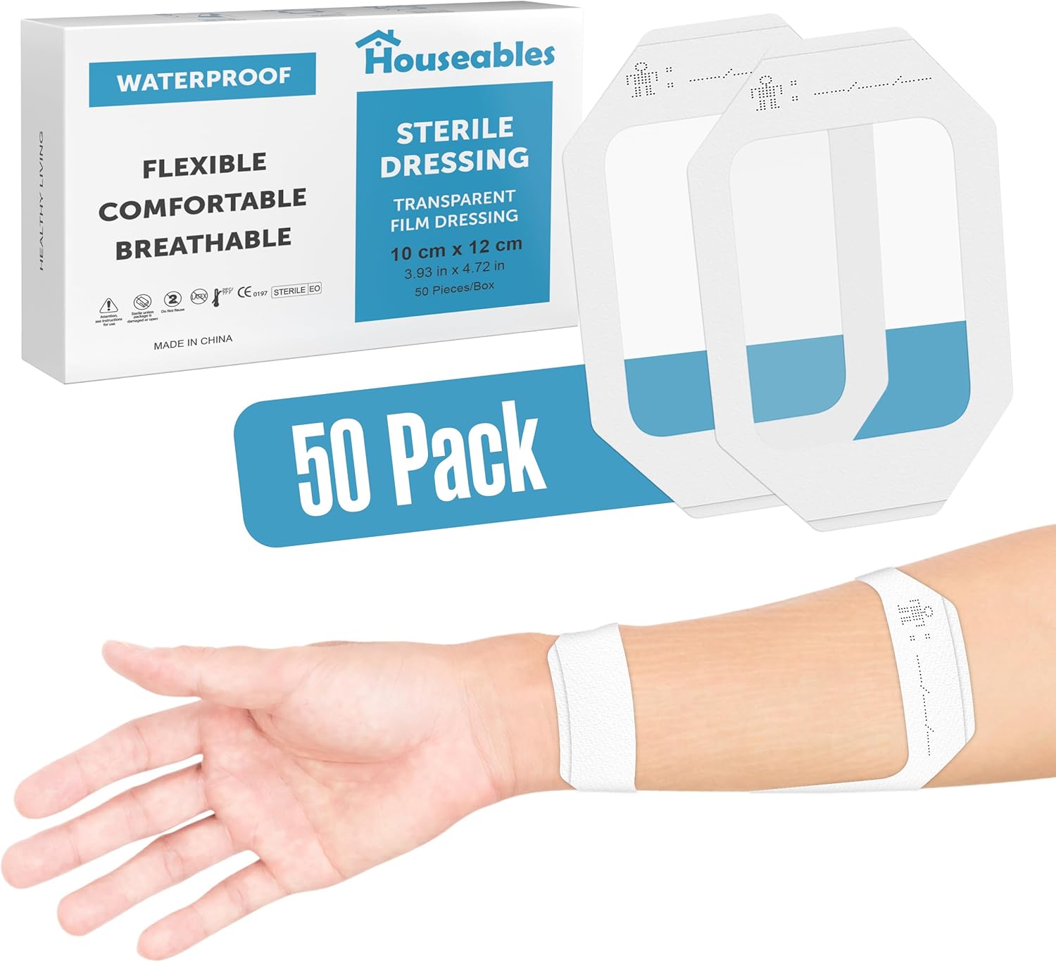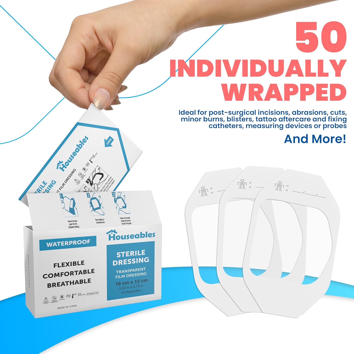 Apósito de película transparente Houseables, vendajes para cubrir heridas, transparente, 4 pulgadas x 4.75 pulgadas, paquete de 50, parche para piel posquirúrgico, estéril, sellado a presión transpirable, impermeable, barrera bacteriana, a prueba de agua