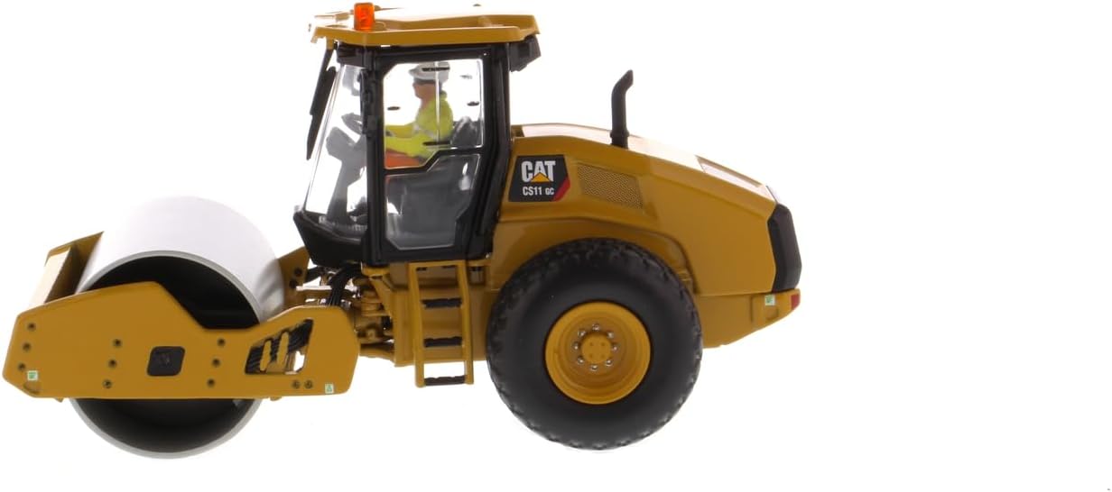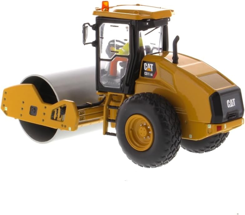AUTHENTIC SCALE REPLICA W/ OUTSTANDING DETAILS - Diecast Masters Caterpillar CS11 GC Soil Compactor in 1:50 scale includes authentic Caterpillar black & yellow paint, decals, and trade dress. The model features a large compacting drum at the front of the machine which can be rotated.