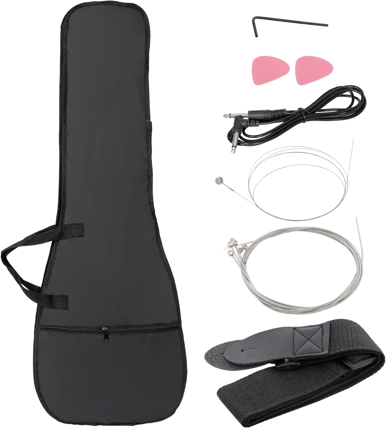 Smartxchoices Electric Guitar is a brand new 30"functional Electric Guitar. Good quality, beautiful surface especially the perfect size make it an ideal choice for your kids. It is lightweight and easy to carry. 30” scale is easier for small hands to manage. All accessories you need to start playing the guitar right away are included. This combo is perfect for kids and would make a great gift. Features: 30" Full size electric guitar Guitar Dimensions: 30"(L) x 10.4"(W) x 3.6"(H) Painting Surface: Polished Body: hardwood Finger board: rose wood Machine Heads: Chrome Diecast AMP Specifications: Amp Dimensions: 5"(L) x 2.5"(W) x 5"(H) 5 watts Two band EQ Volume, base tone and treble control Headphone out Package Include: 1 x 30'' electric gutiar 1 x 5 watt amplifier 1 x 420D bag 1 x guitar strap 1 x guitar cable 1 x additional strings set +1#additional string 2 x pick 1 x allen key Warm note: Recommended for children 3 years and up No assembly required It's 9V battery for the 5W amp( Battery not included) Any other question please feel free to contact seller first! We will be more than happy to help you!