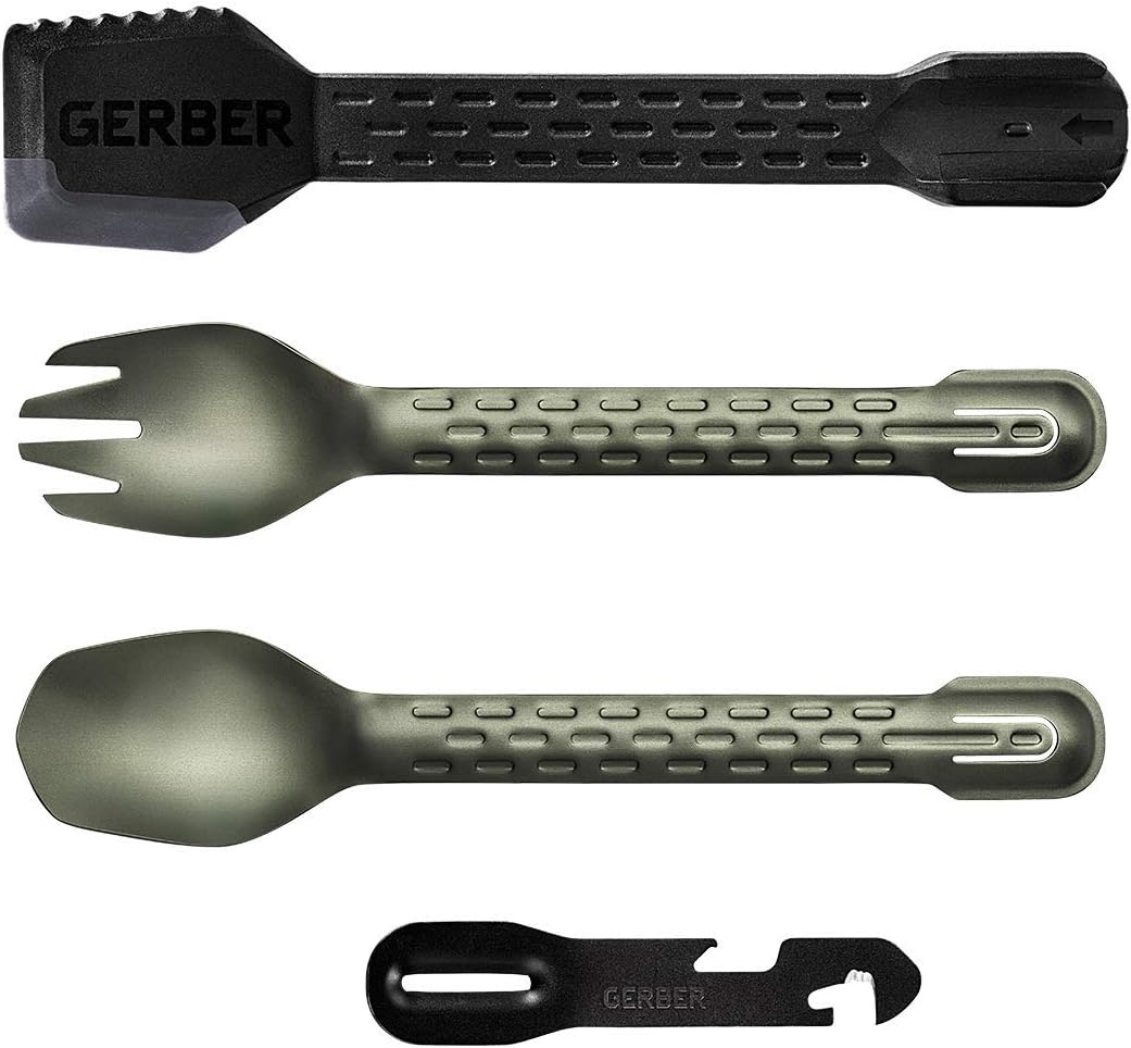 En el camino, la comida más importante del día es la que estás a punto de comer.™ La herramienta completa GERBER tiene las bases cubiertas con un tenedor, una cuchara, una espátula y una herramienta múltiple de 4 funciones que se anidan para el transporte y se unen para convertir en pinzas funcionales para cocinar, comer, limpiar y volver a salir.