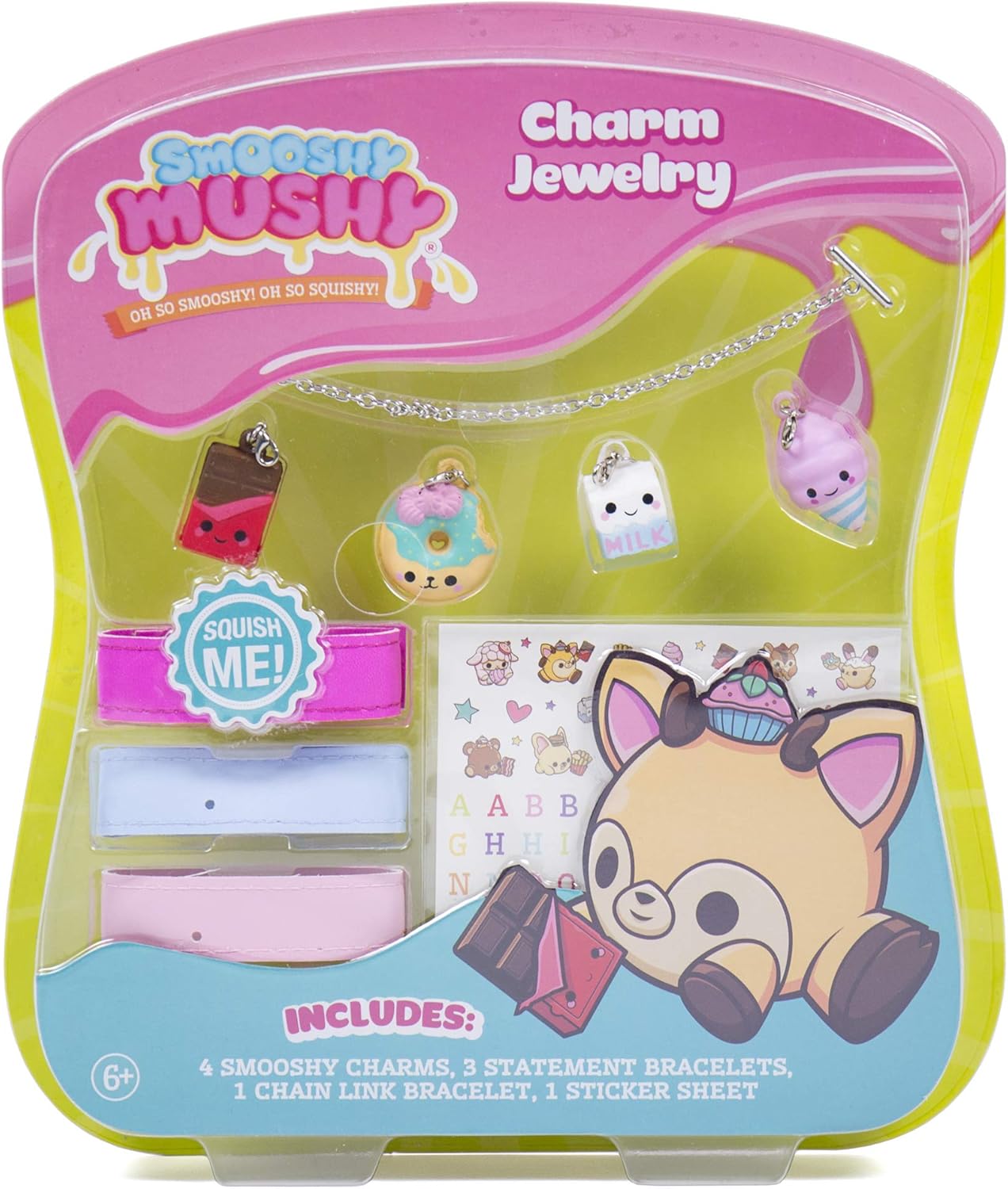 Crea una bonita pulsera de abalorios que puedas suavizar y aplastar con la joyería Smooshy Mushy Charm Jewerly. Decora una pulsera de eslabones de cadena con algunas de tus mascotas favoritas, como Mooky Milky & Cami Cotton Candy, y crea tres pulseras personalizadas para usar o compartir con tus amigos. Añade tus propias frases divertidas, íconos y personajes adorables, incluidos Lolli Lamb y Felina Fawn, con la hoja de pegatinas fácil de despegar. ¡Crea un puñado de pulseras blandas y suaves para presumir y apretar todo el día! Recomendado para los amantes de Smooshy Mushy de 6 años en adelante.