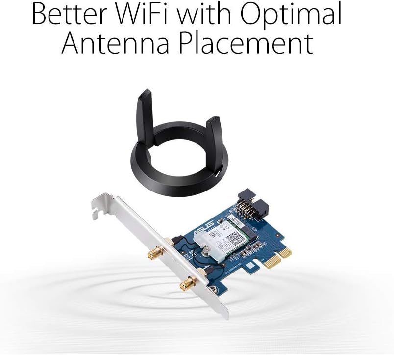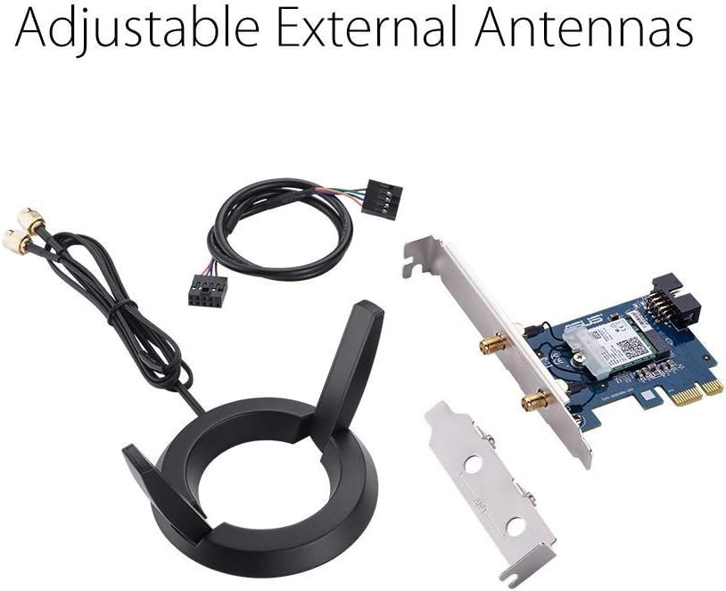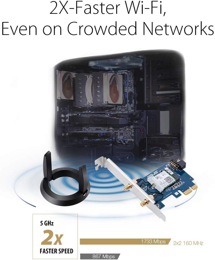 El adaptador WiFi ASUS PCE-AC58BT AC2100 cuenta con soporte de 160MHz y la última generación de Bluetooth 5 para proporcionar máxima banda ancha, velocidades y fiabilidad. La tecnología MU-MIMO también permite transmisiones de datos simultáneas para asegurar menos conexiones perdidas, y la base de antena externa adicional proporciona aún más cobertura y alcance a tu computadora.