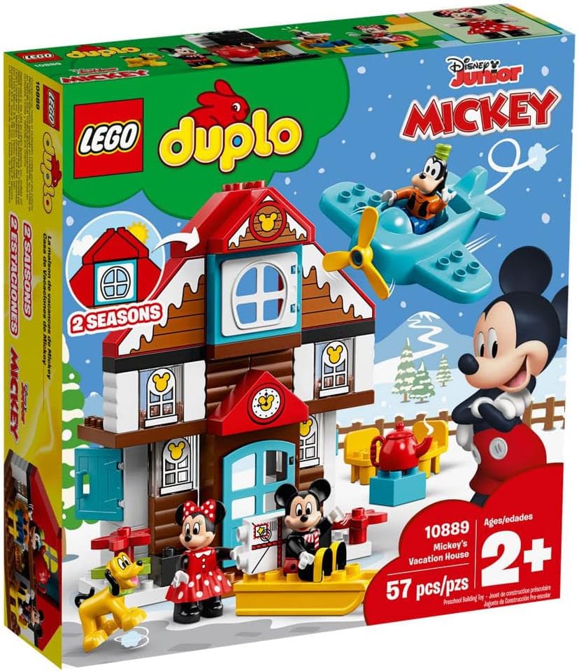 This Vacation House buildable toy playset includes 4 LEGO DUPLO figures: Pluto, Goofy, Mickey Mouse and Minnie Mouse and double-sided summer/winter roof bricks to let kids switch between seasons