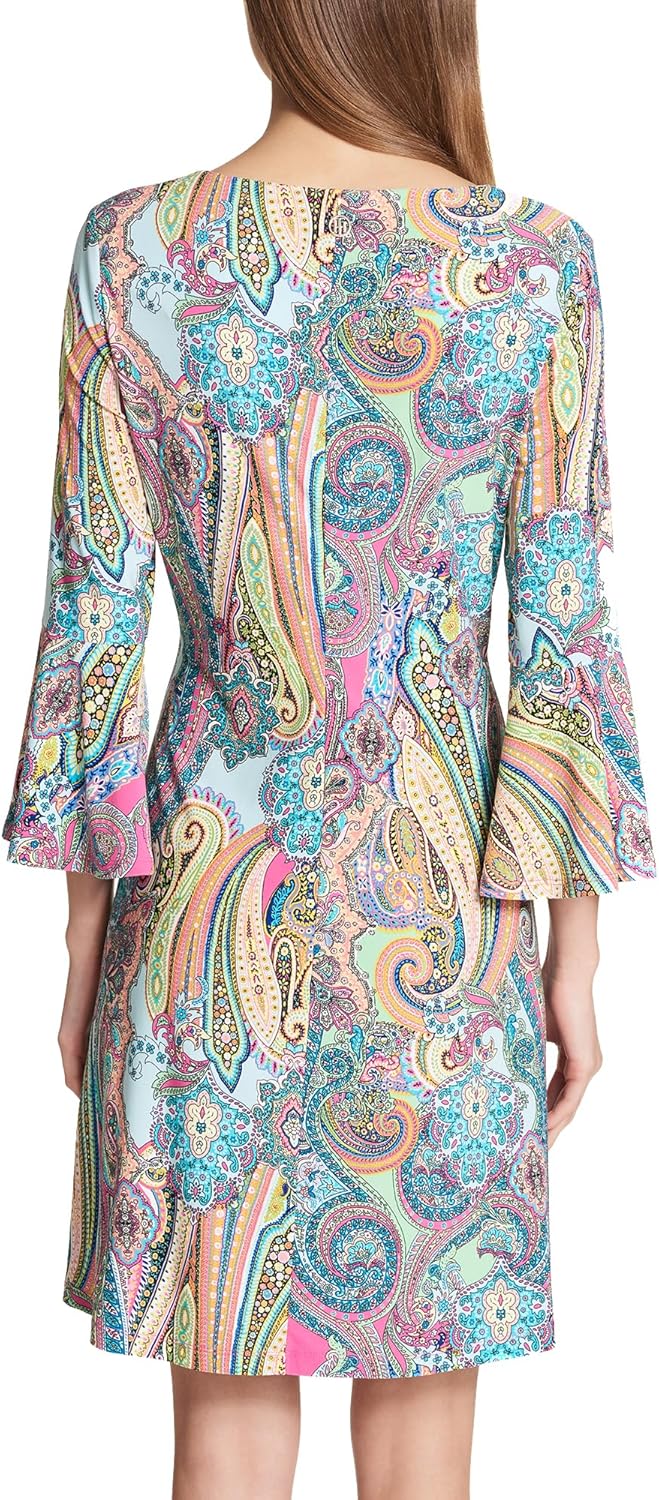 Este vestido de mujer Tommy Hilfiger de estilo shift es de manga campana larga con cuello redondo y estampado Paisley suave