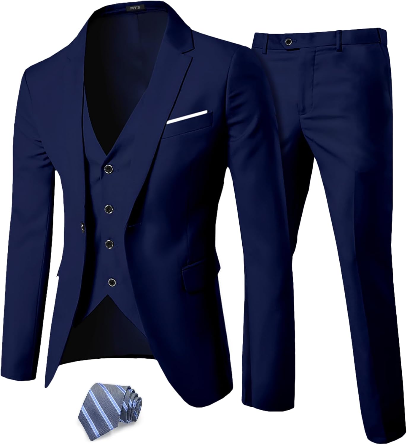 MY'S Men's 3 Piece Suit Set with Tie, One Button Slim Fit Solid Jacket Vest Pants, Prom Party Wedding Business Suits for Men