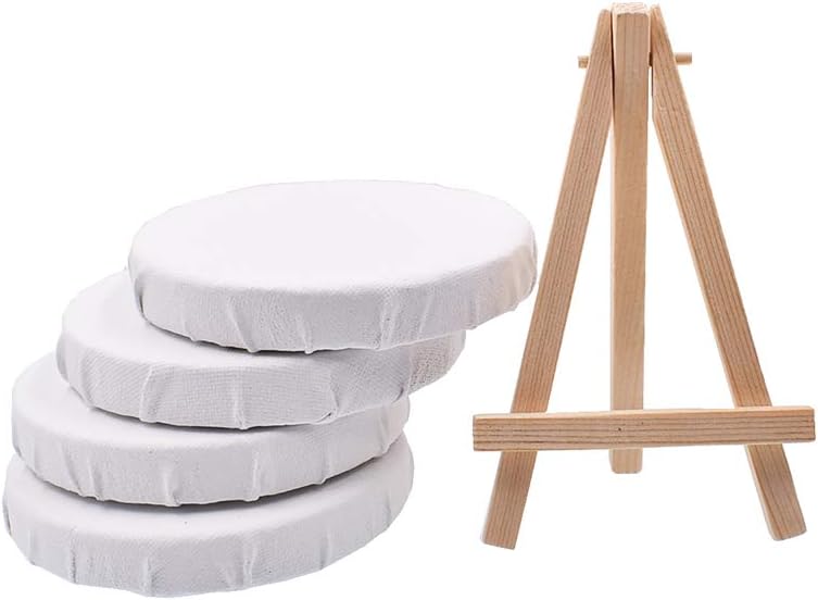 RayLineDo Set of 4pcs Mini Round Shaped Artist Blank Canvas Frame 4inch ( 10cm ) Oil Water Painting Board Flat Canvas with 1pc Mini Wood Display EaselSet of 4pcs Mini Round Shaped Artist Blank Painting Canvas Frame - 4inch ( 10cm ).These high quality mini blank canvas are made of 100% pure cotton, with a smooth surface, help you to finish different style paintings or craft projects, also to enrich your painting experience and fun.Strong frame edge 15mm deep, made from MDF board, fine textured.Package Included: 4pcs 4inch mini round shaped artist blank painting canvas and 1pc mini display easel.The canvases come in various sizes and shapes, and are ideal for painting with acrylic or oil paints. Notice: Please tear the plastic film off before painting.