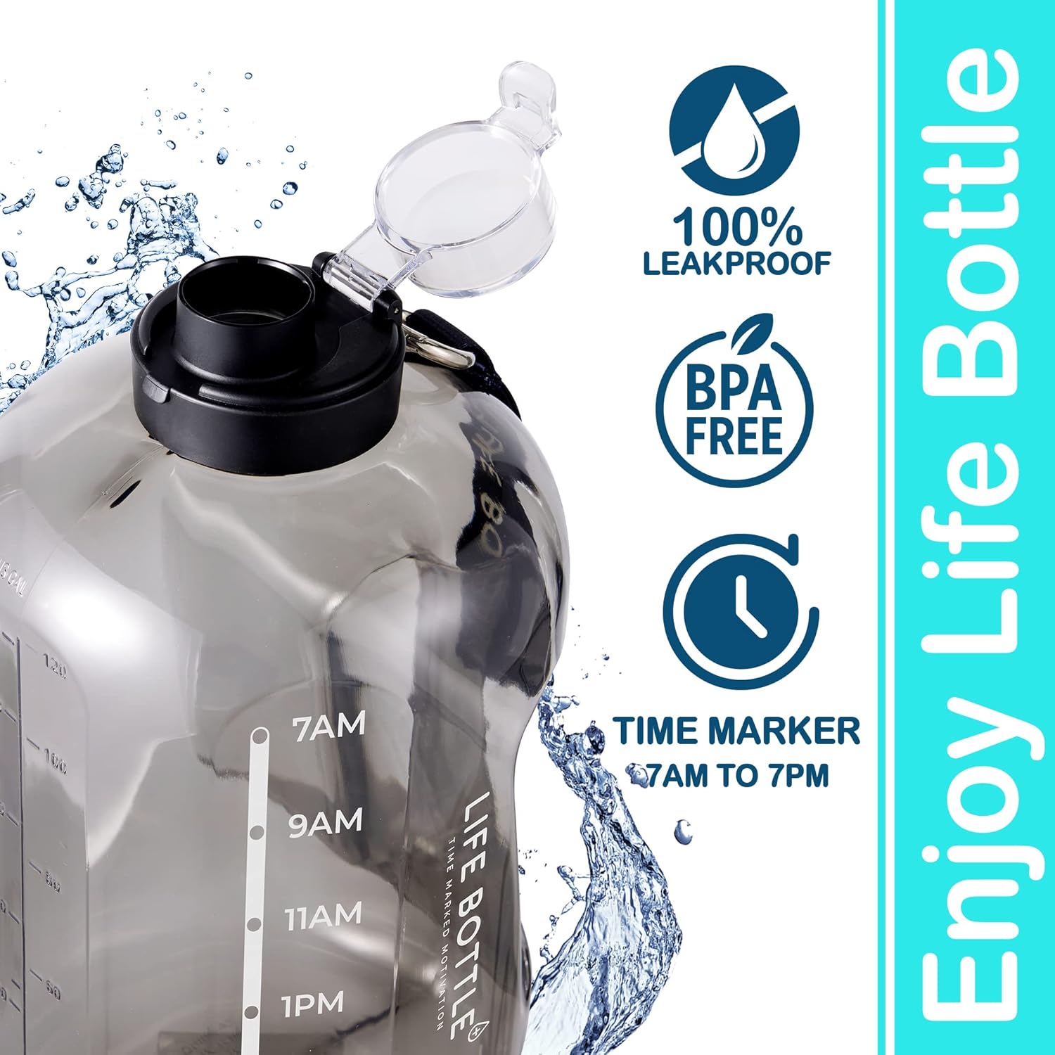 Las marcas de tiempo adecuadas: ¿Te gusta levantarte temprano para ir al baño? Entonces olvídate de las botellas rastreadoras de agua que terminan a las 9 p.m En cambio, Life Bottle cuida de ti de 7 a. m. a 7 p. m., para que tu cuerpo reciba todo lo que necesita: ¡hidratación completa y un descanso nocturno completo! Por lo tanto, pruebe nuestro recipiente de un galón ahora y sienta lo que es despertarse sintiéndose y luciendo más joven.