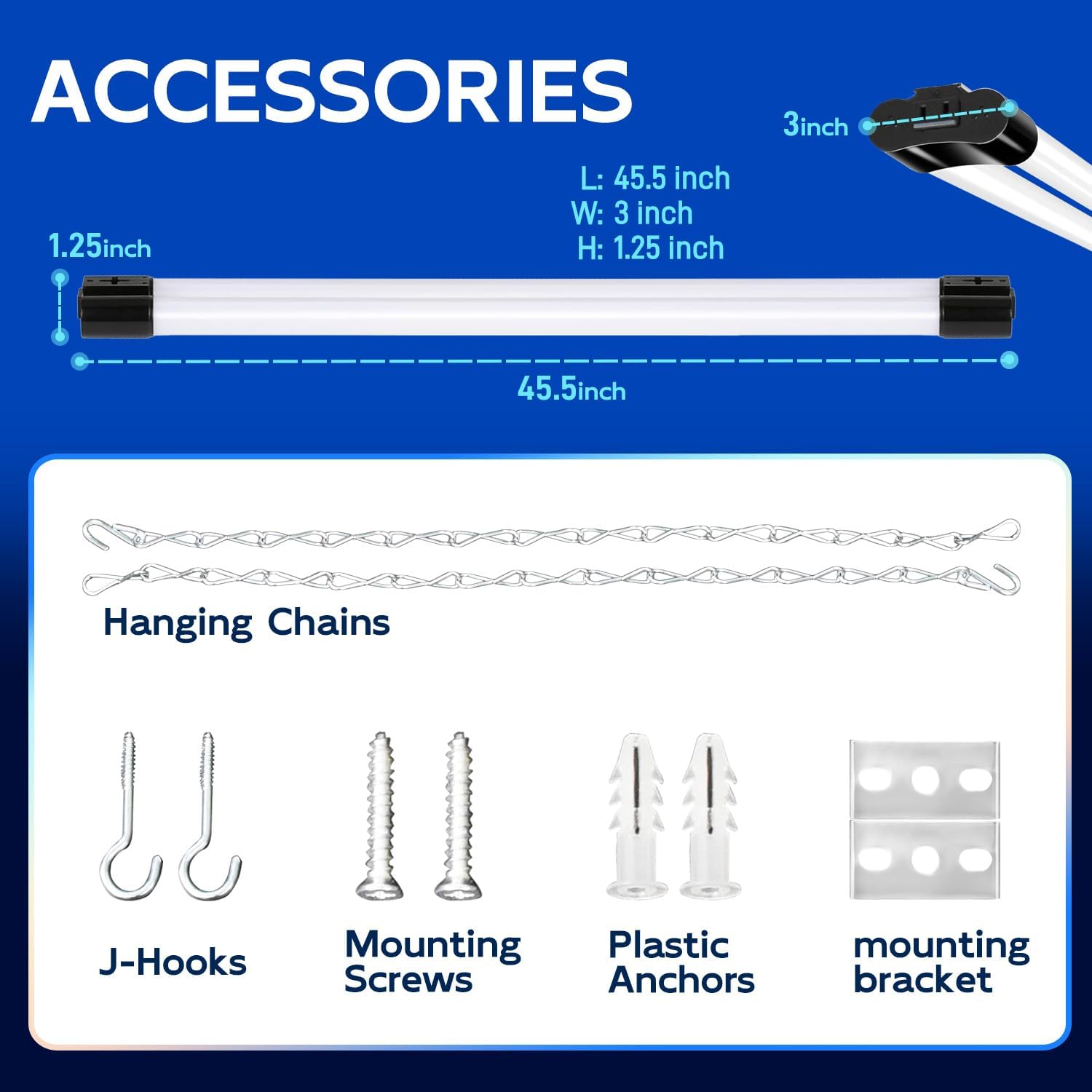 ✅ Easy Installation - Plug & Play. Come with 59" power cord with on/off switch and other small accessories. You can hanging it with the included hanging chains or directly mounted to the ceiling with the included mounting screws.