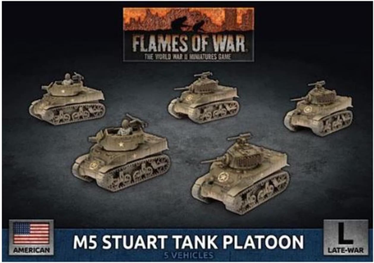 Flames of War: Pelotón de Tanques M5 Stuart Americano (Final de la Guerra) El M5 es la segunda versión principal del tanque ligero Stuart. El nuevo modelo tiene un poco más de protección blindada, así como una torreta más grande. Este paquete contiene cinco tanques M5 Stuart o cañones de asalto M8 Scott (75mm), una hoja de calcomanías y siete tarjetas de unidad.