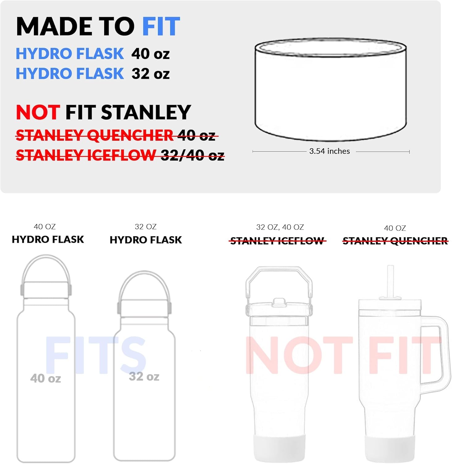 (Designed to fit) Owala FreeSip 40 oz, Hydro Flask Wide Mouth 32 oz, Hydro Flask Wide Mouth 40 oz and similar style bottles. This product does NOT* fit Stanley bottles. Please refer to the second picture on the listing for visual compatibility.