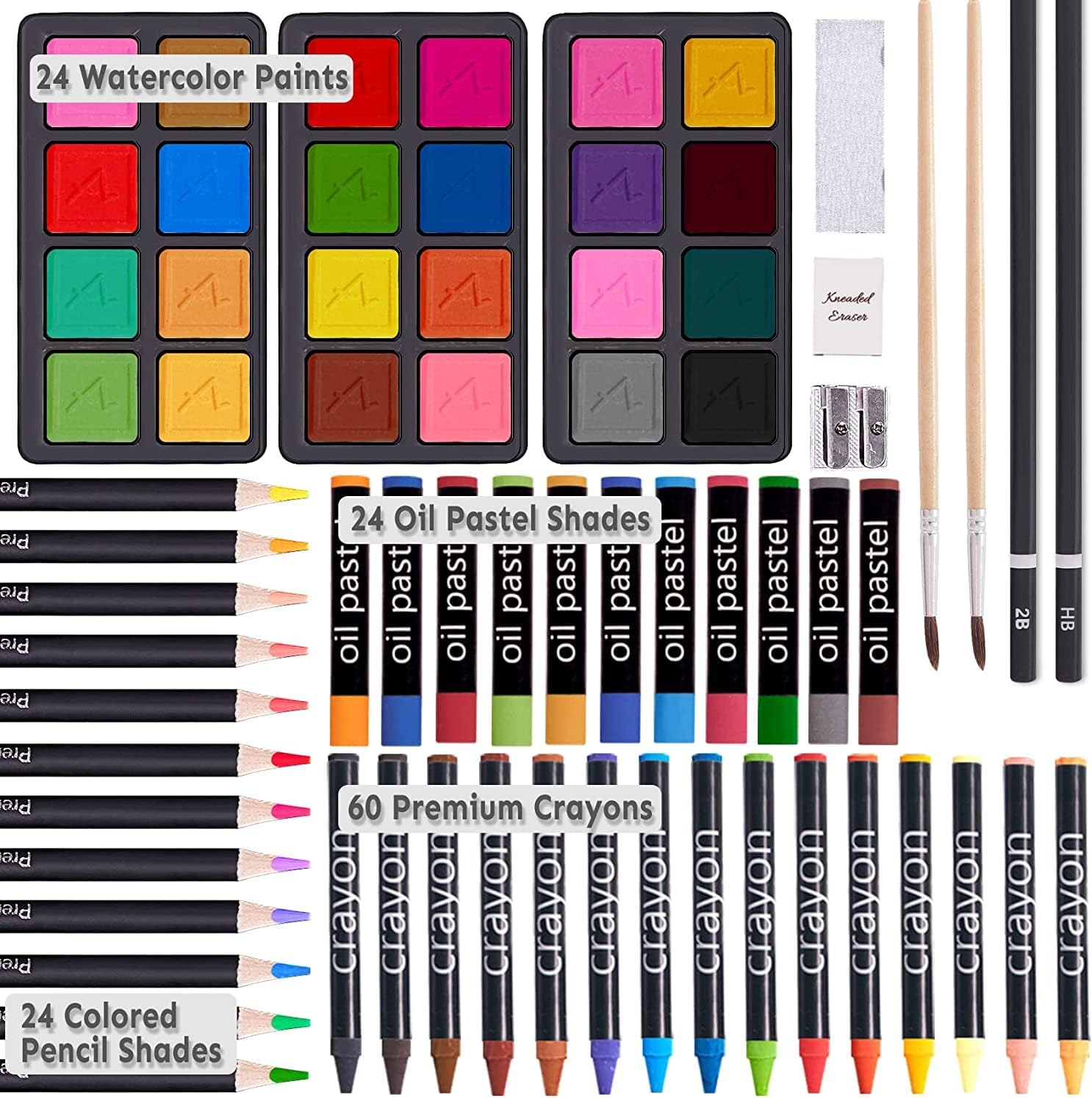 Contenido del Set de Arte: Contiene 60 crayones, 24 pasteles de óleo, 24 lápices de color, 24 pasteles de agua, 2 pinceles, paletas de 3x8 compartimentos, 2 lápices de dibujo, 1 sacapuntas, 1 bloque de lija, 1 borrador de arte y 1 caja de madera