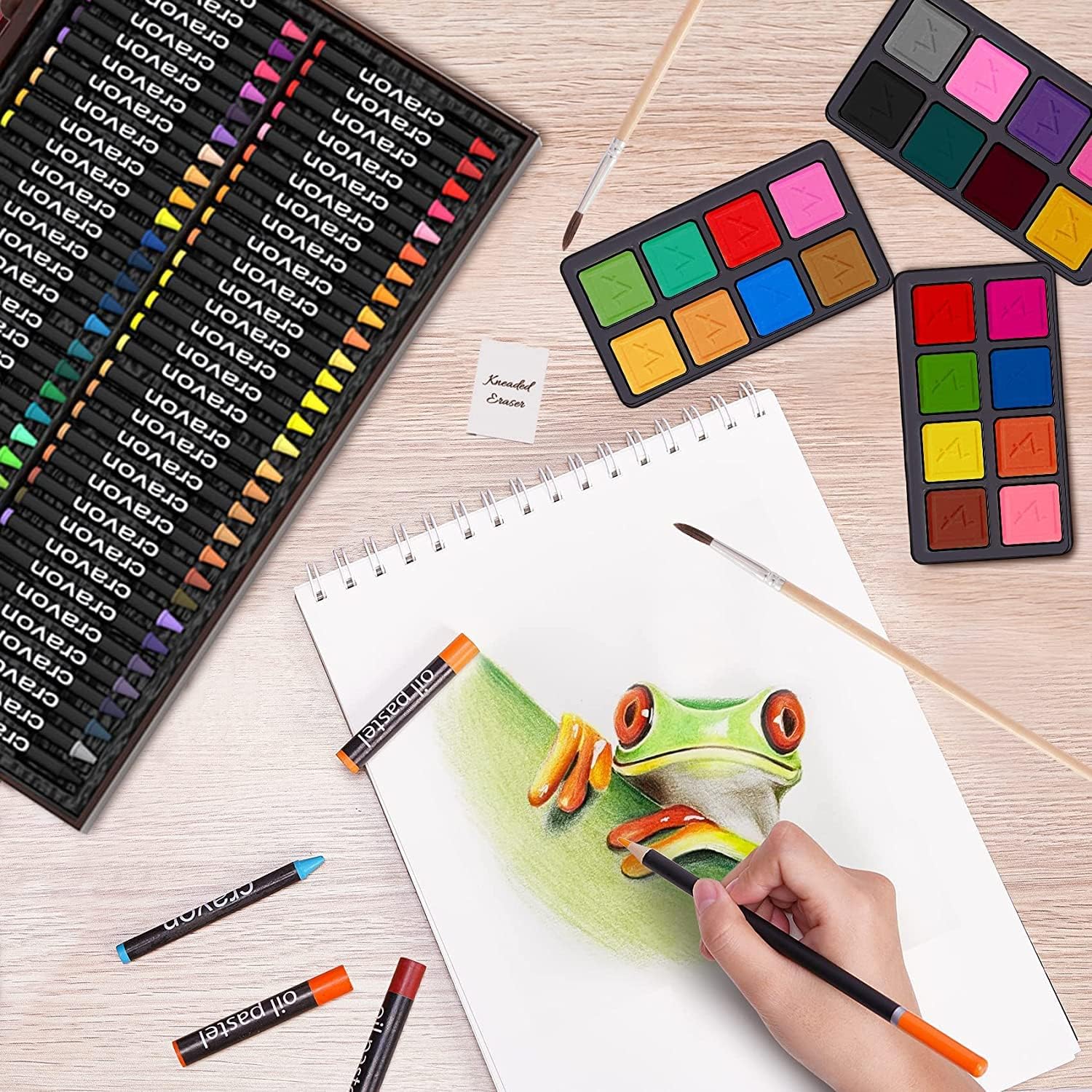 Seguro y No Tóxico: Todos los suministros de arte están en una caja de madera y los crayones, lápices y pasteles son no tóxicos
