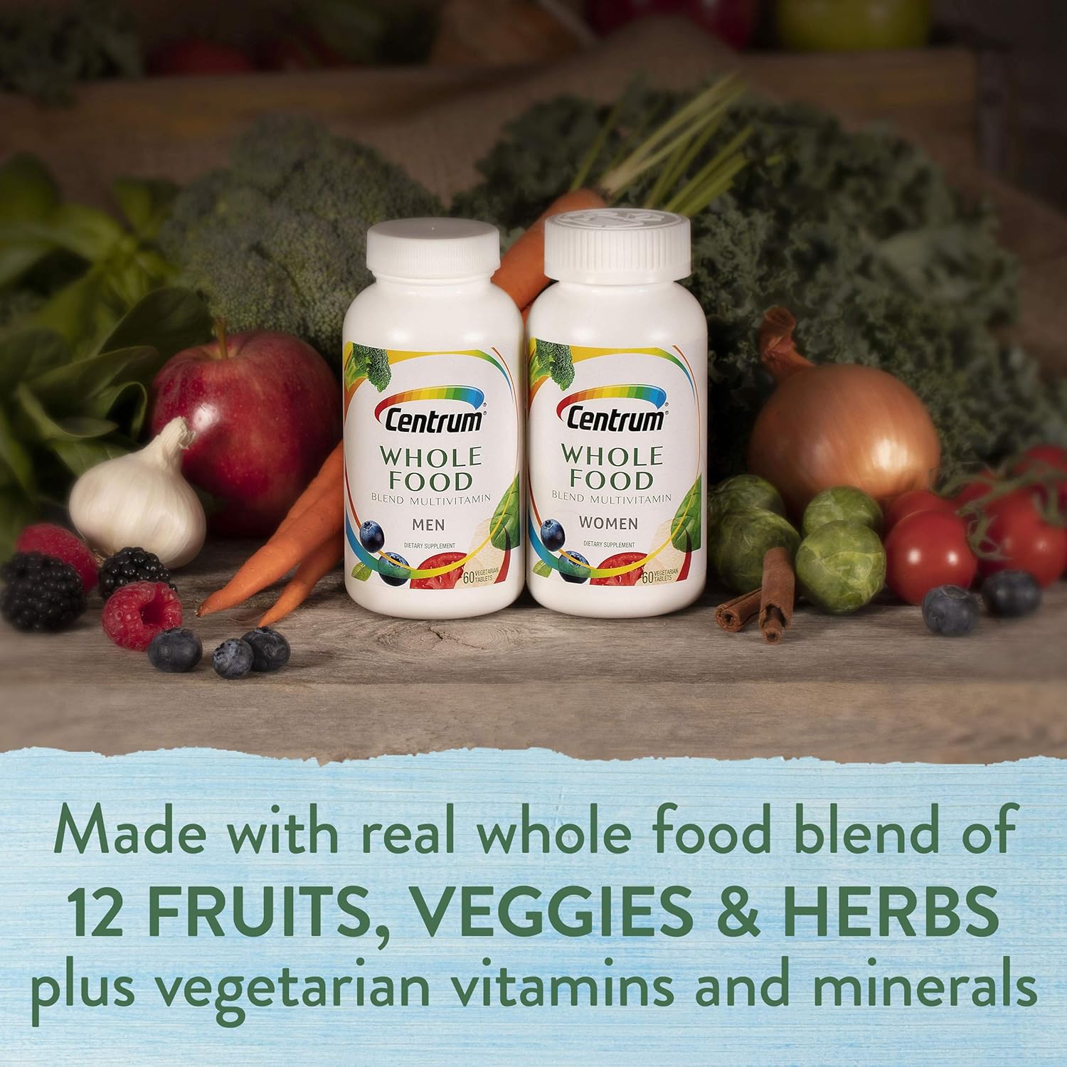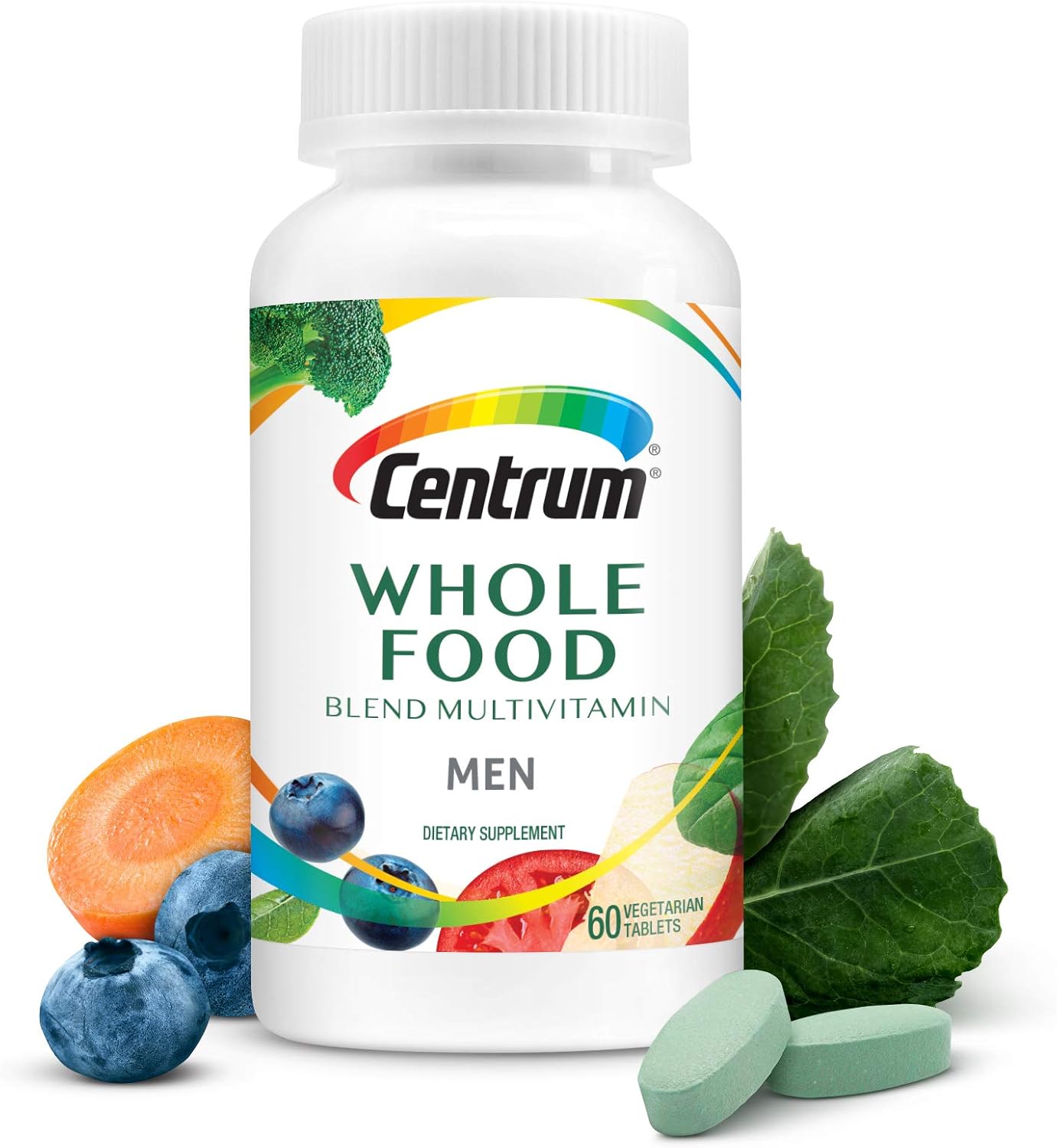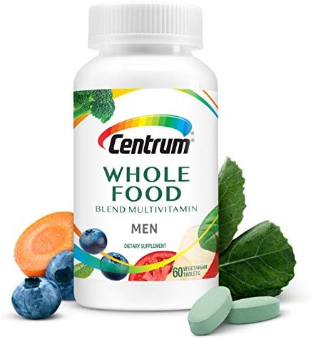 Your cells get hungry. Feed them with Centrum Whole food multivitamin for men. This potency packed multivitamin is a blend of real fruits, vegetables, and herbs, plus vegetarian cultured vitamins and minerals to support health, energy, and immune health—plus targeted benefits for men including vitality, heart health, muscle function, and metabolism. Each bottle contains 60 micronutrient rich tablets for a 30 day Supply. Mindfully crafted from naturally-sourced fruits, vegetables, and herbs, Centrum Whole food men's multivitamin is scientifically proven to inhibit free radical production and support cellular metabolic activity.* Centrum Whole food men's multivitamin does not contain added sugar, soy, nut, dairy, any artificial flavors or preservatives. It is gluten-free, vegetarian, as well as Keto- and Paleo-Friendly. It's simple nourishment made with real whole foods, so you can let your best self shine. Satisfaction guarantee If for any reason you are not satisfied with any gsk consumer healthcare product, gsk consumer healthcare will provide you with a reimbursement within 45 days of the date of purchase. Please note that because gsk is unable to control the quality of our products sold by unauthorized sellers, the guarantee is not available for products purchased from unauthorized sellers due to potential quality issues outside gsk’ S control. Please contact gsk consumer healthcare directly for more information. This statement has not been evaluated by the Food and Drug Administration. This product is not intended to diagnose, treat, cure, or prevent any disease.(1) b-vitamins support daily energy needs and aid in the metabolism of carbohydrates, fats and proteins.Vitamins A, C, D, E and the mineral zinc support normal immune function. B-vitamins plus Vitamin C support a healthy stress response. Antioxidant nutrients, including vitamin E, Zinc and selenium, support vitality. Vitamin D supports bone health in combination with calcium. Take with a calcium-rich diet. Vitamins A, C and Biotin plus zinc help support healthy skin, hair, nails and appearance. Vitamins D and B6 help support muscle function. B-vitamins, vitamins C and E, and Lycopene support heart health. This product is not intended to provide daily intake of lycopene. Take with a diet rich in fruits and vegetables. B-vitamins and zinc help support normal nervous system and brain health. Antioxidant activity from vitamins C and E, beta-carotene, lutein, Lycopene and the fruit and vegetable blend helps defend against free radicals.(>) Journal of food Science and nutrition, 2014(2) American Journal of clinical nutrition, 1995